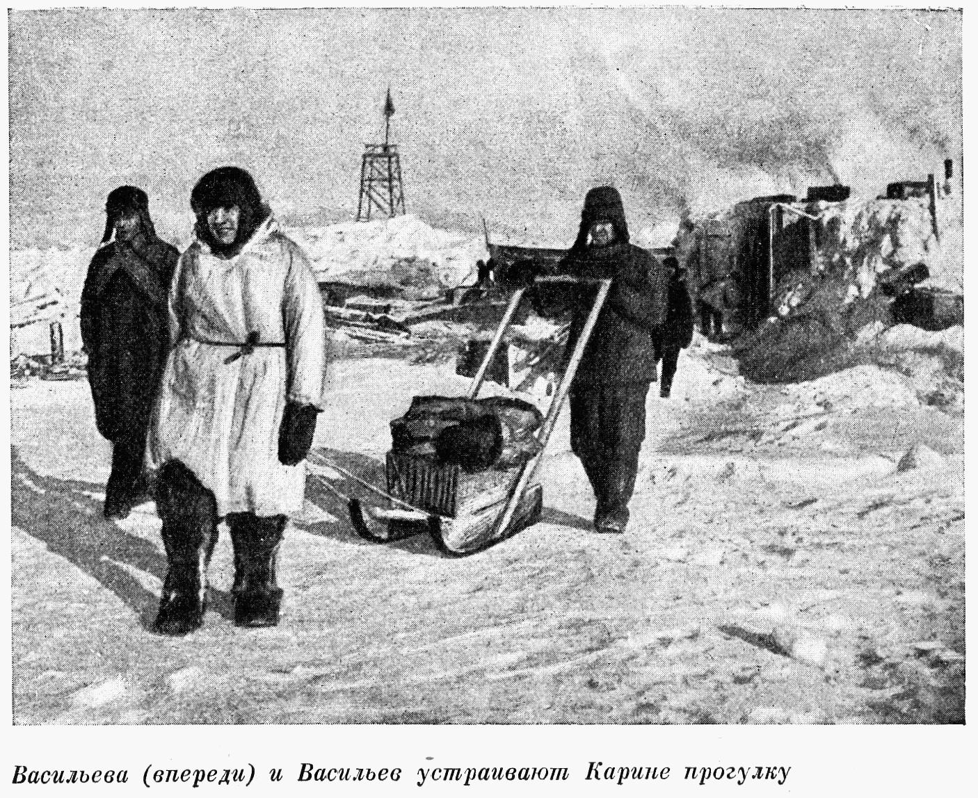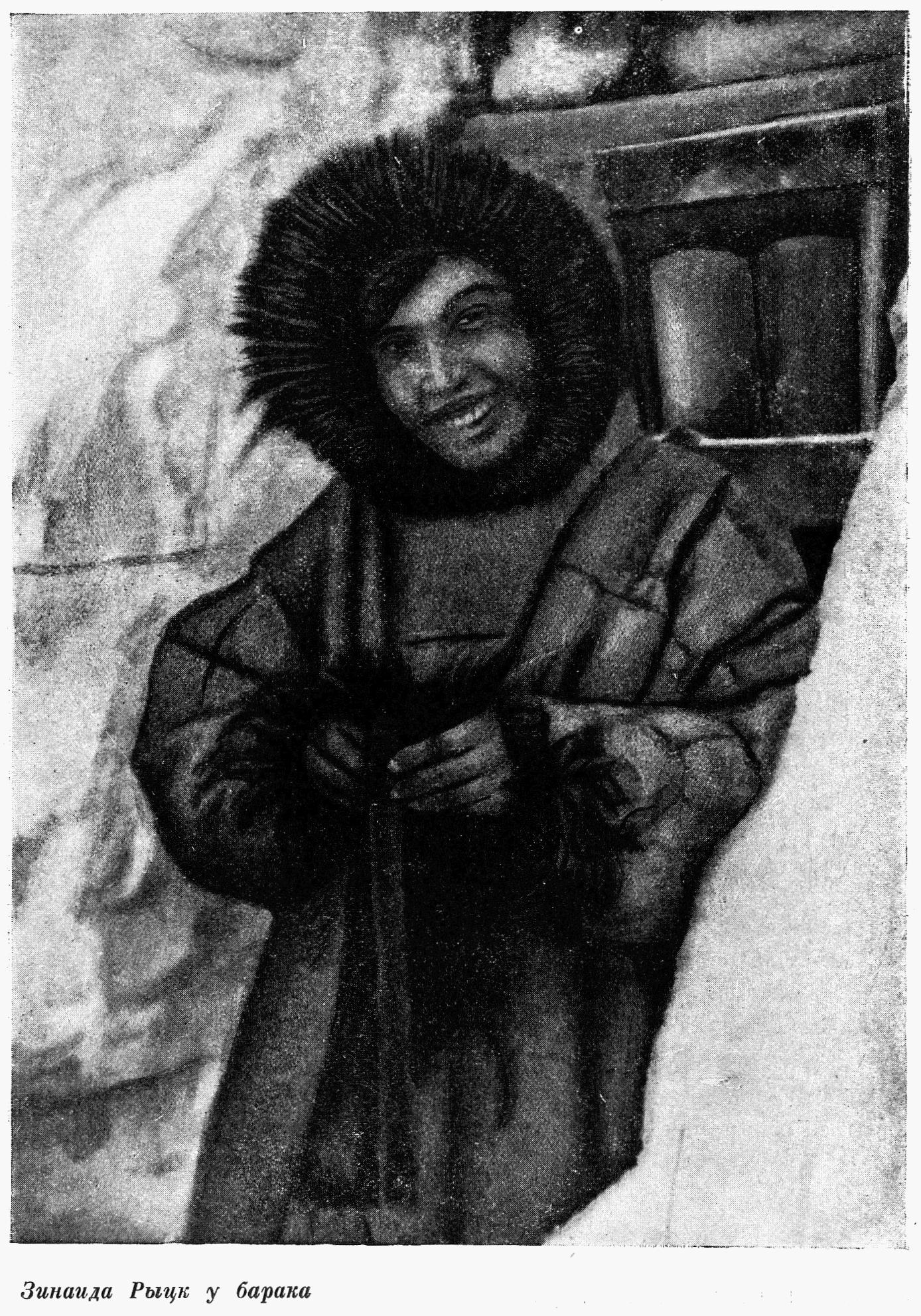 День в лагере. Встаем в семь часов утра. Пьем плиточный чай с сахаром и галетами. По норме их положено две, а хочется больше... В 8 часов 30 минут начинаются работы по лагерю. Плотники строят сигнальную 15-метровую будку. Она будет прекрасным опознавательным знаком, если не обвалится торос, на котором она стоит. В 12-13 часов — обед на 104 человека: суп из 25 банок консервов с крупой или с сухими овощами; на второе -опять тот же чай. В 16 часов кончаются работы. В это время выдается ужин из кухни, похожей теперь благодаря трещине на водяную мельницу. Ужин обычно состоит из гречневой каши, но сегодня — рисовая с маслом.