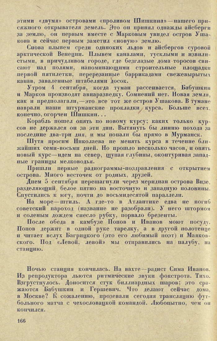 Ночью станция кончилась. На вахте — радист Сима Иванов. Из репродуктора льются ритмические звуки фокстрота. Тихо. Взгрустнулось. Доносится стук биллиардных шаров; это сражаются Бабушкин и Гершевич. Что делают сейчас дома, в Москве? К сожалению, прозевали сегодня трансляцию футбольного матча с чехословацкой командой. Любопытно, чем он кончился.