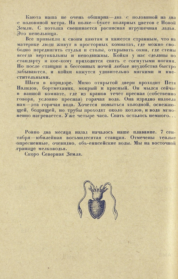 Все привыкли к своим каютам и кажется странным, что на материке люди живут в просторных комнатах, где можно свободно передвигать стулья и столы, открывать окна, где стены всегда вертикальны и неподвижны. Койки у нас сделаны по стандарту и кое-кому приходится спать с согнутыми ногами. Но после станции и бессонных ночей любые неудобства быстро забываются, и койки кажутся удивительно мягкими и вместительными.