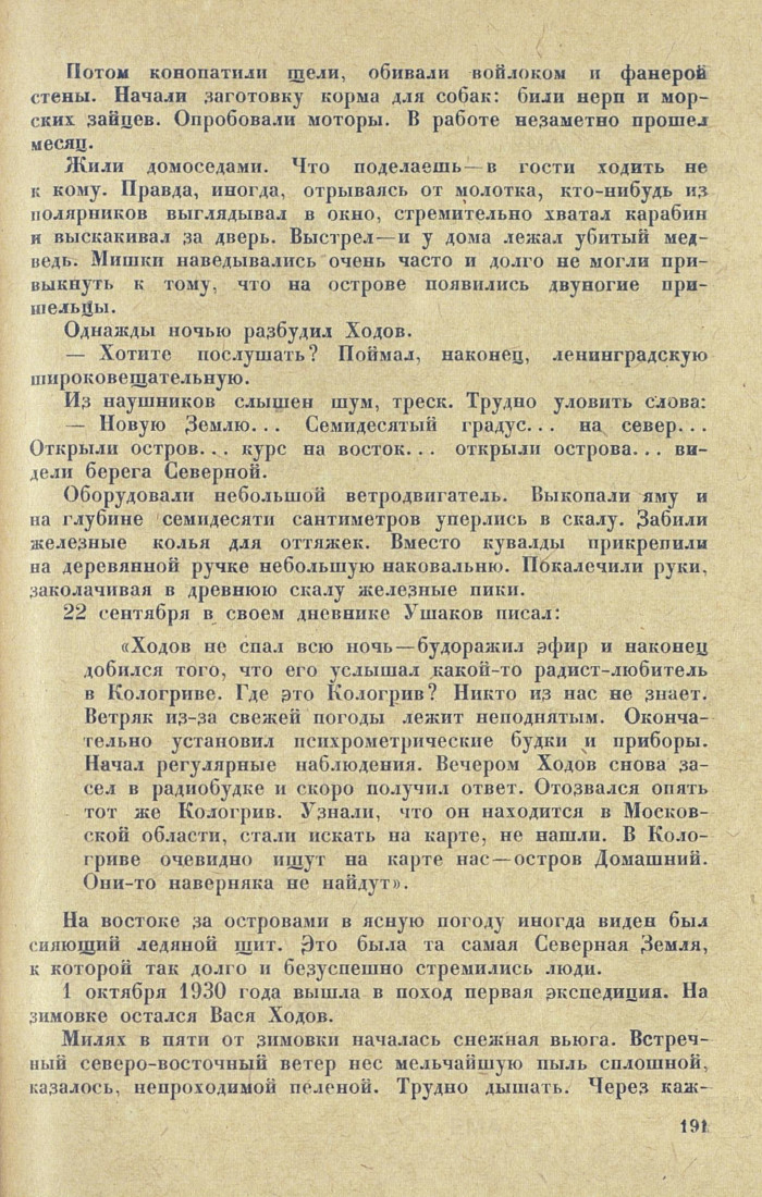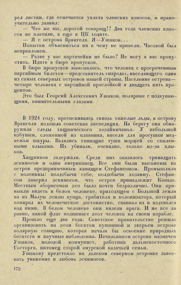 Прошло еще два года. Советское правительство решило организовать на этом богатом пушниной и зверьем острове полярную станцию, которая начала бы освоение природных богатств и научные наблюдения. Начальником острова назначен Ушаков, молодой коммунист, работник дальневосточного Госторга, питомец старой амурской казачьей семьи.