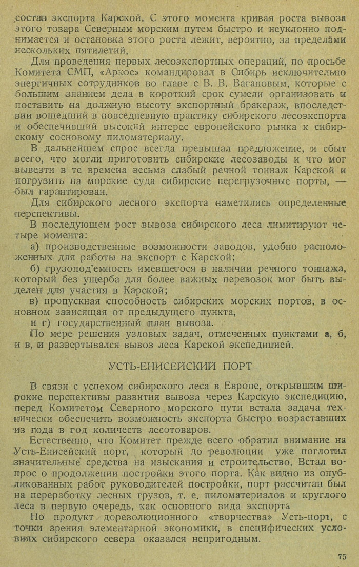 Естественно, что Комитет прежде всего обратил внимание на Усть-Енисейский порт, который до революции уже поглотил значительные средства на изыскания и строительство. Встал вопрос о продолжении постройки этого порта. Как видно из опубликованных работ руководителей постройки, порт рассчитан был на переработку лесных грузов, т. е. пиломатериалов и круглого леса в первую очередь, как основного вида экспорта.