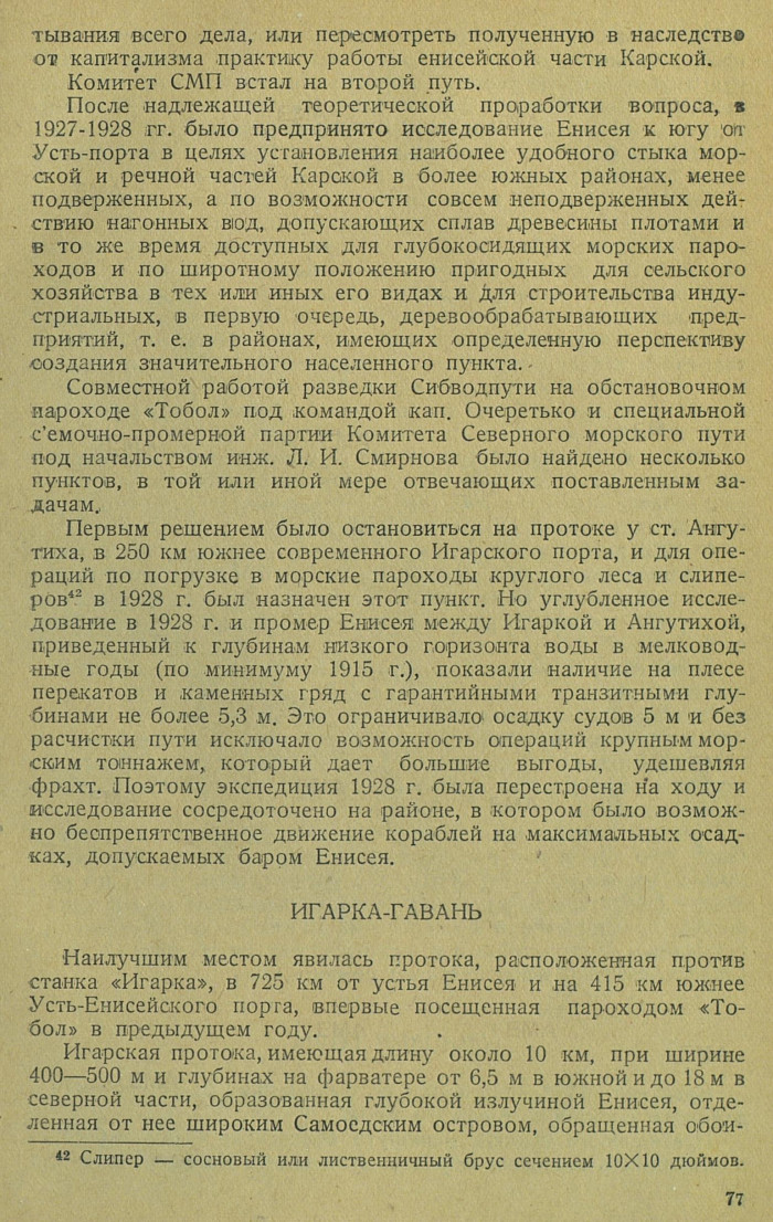 Первым решением было остановиться на протоке у ст. Ангутиха, в 250 км южнее современного Игарского порта, и для операций по погрузке в морские пароходы круглого леса и слиперов {42} в 1928 г. был назначен этот пункт. Но углубленное исследование в 1928 г. и промер Енисея между Игаркой и Ангутихой, приведенный к глубинам низкого горизонта воды в мелководные годы (по минимуму 1915 г.), показали наличие на плесе перекатов и. каменных гряд с гарантийными транзитными глубинами не более 5,3 м. Это ограничивало осадку судов 5 м и без расчистки пути исключало возможность операций крупным морским тоннажем, который дает большие выгоды, удешевляя фрахт. Поэтому экспедиция 1928 г. была перестроена на ходу и исследование сосредоточено на районе, в котором было возможно беспрепятственное движение кораблей на максимальных осадках, допускаемых баром Енисея.