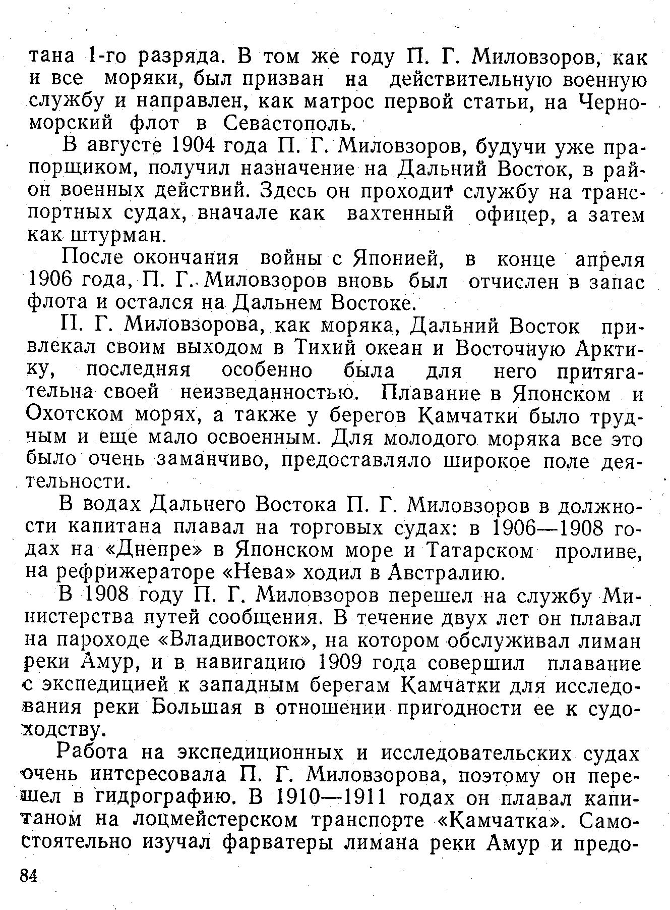 П. Г. Миловзорова, как моряка, Дальний Восток привлекал своим выходом в Тихий океан и Восточную Арктику, последняя особенно была для него притягательна своей неизведанностью. Плавание в Японском и Охотском морях, а также у берегов Камчатки было трудным и еще мало освоенным. Для молодого моряка все это было очень заманчиво, предоставляло широкое поле деятельности.