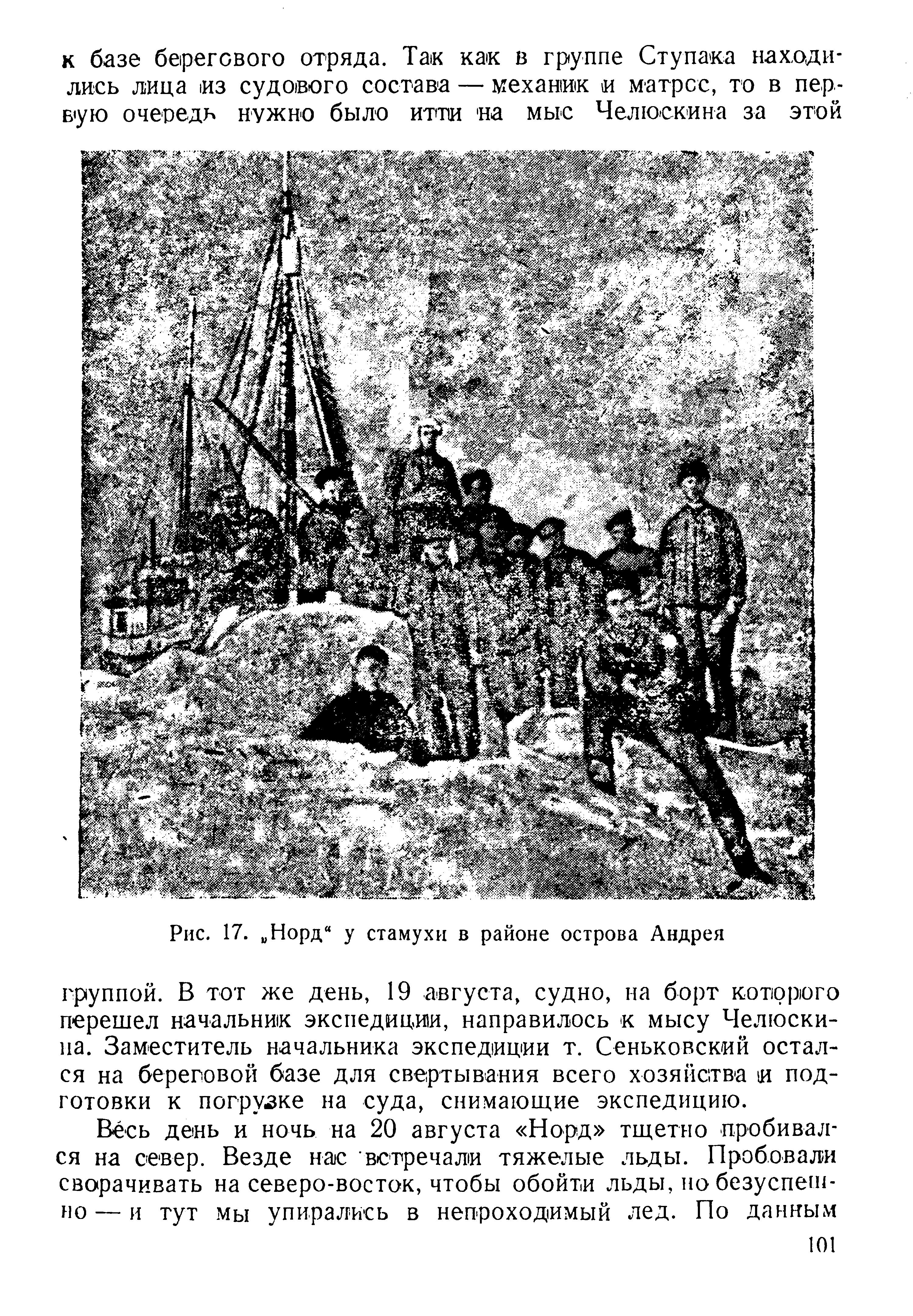 к базе берегового отряда. Так как в группе Ступака находились лица из судового состава — механик и матрос, то в первую очередь нужно было итти на мыс Челюскина за этой группой. В тот же день, 19 августа, судно, на борт которого перешел начальник экспедиции, направилось к мысу Челюскина. Заместитель начальника экспедиции т. Сеньковский остался на береговой базе для свертывания всего хозяйства и подготовки к погрузке на суда, снимающие экспедицию.