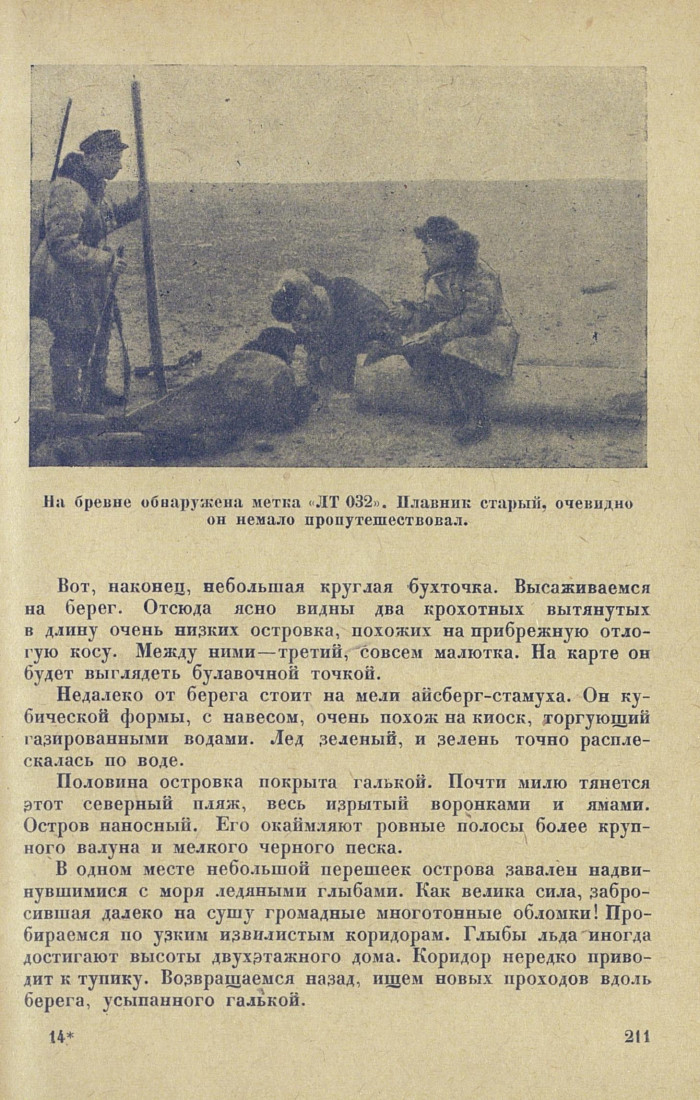 В одном месте небольшой перешеек острова завален надвинувшимися с моря ледяными глыбами. Как велика сила, забросившая далеко па сушу громадные многотонные обломки! Пробираемся но узким извилистым коридорам. Глыбы льда иногда достигают высоты двухэтажного дома. Коридор нередко приводит к тупику. Возвращаемся назад, ищем новых проходов вдоль берега, усыпанного галькой.