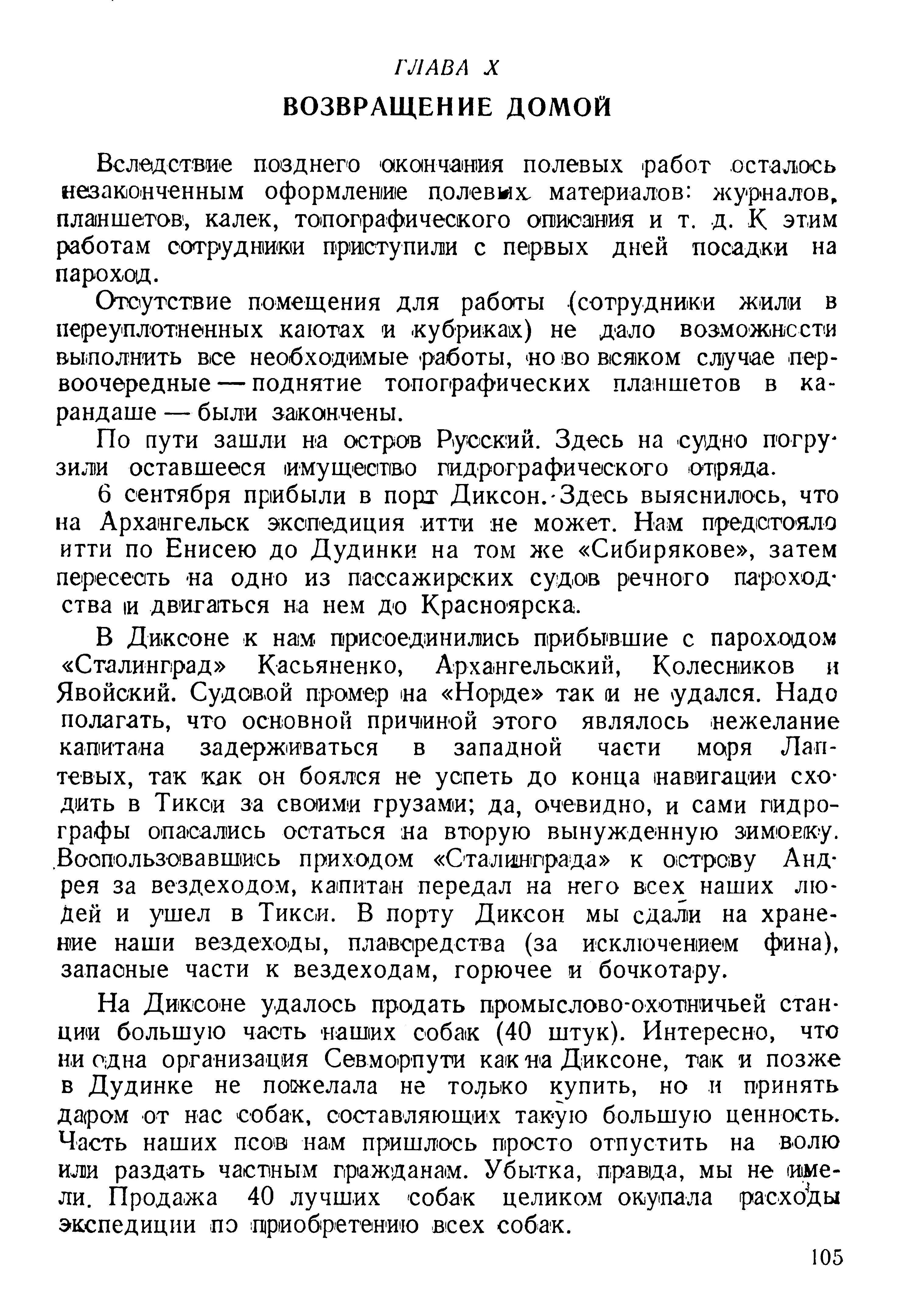 В Диксоне к нам присоединились прибывшие с пароходом «Сталинград» Касьяненко, Архангельский, Колесников и Явойский. Судовой промер на «Норде» так и не удался. Надо полагать, что основной причиной этого являлось нежелание капитана задерживаться в западной части моря Лаптевых, так как он боялся не успеть до конца навигации сходить в Тикси за своими грузами; да, очевидно, и сами гидрографы опасались остаться на вторую вынужденную зимовку. Воспользовавшись приходом «Сталинграда» к острову Андрея за вездеходом, капитан передал на него всех наших людей и ушел в Тикси. В порту Диксон мы сдали на хранение наши вездеходы, плавсредства (за исключением фина), запасные части к вездеходам, горючее и бочкотару.