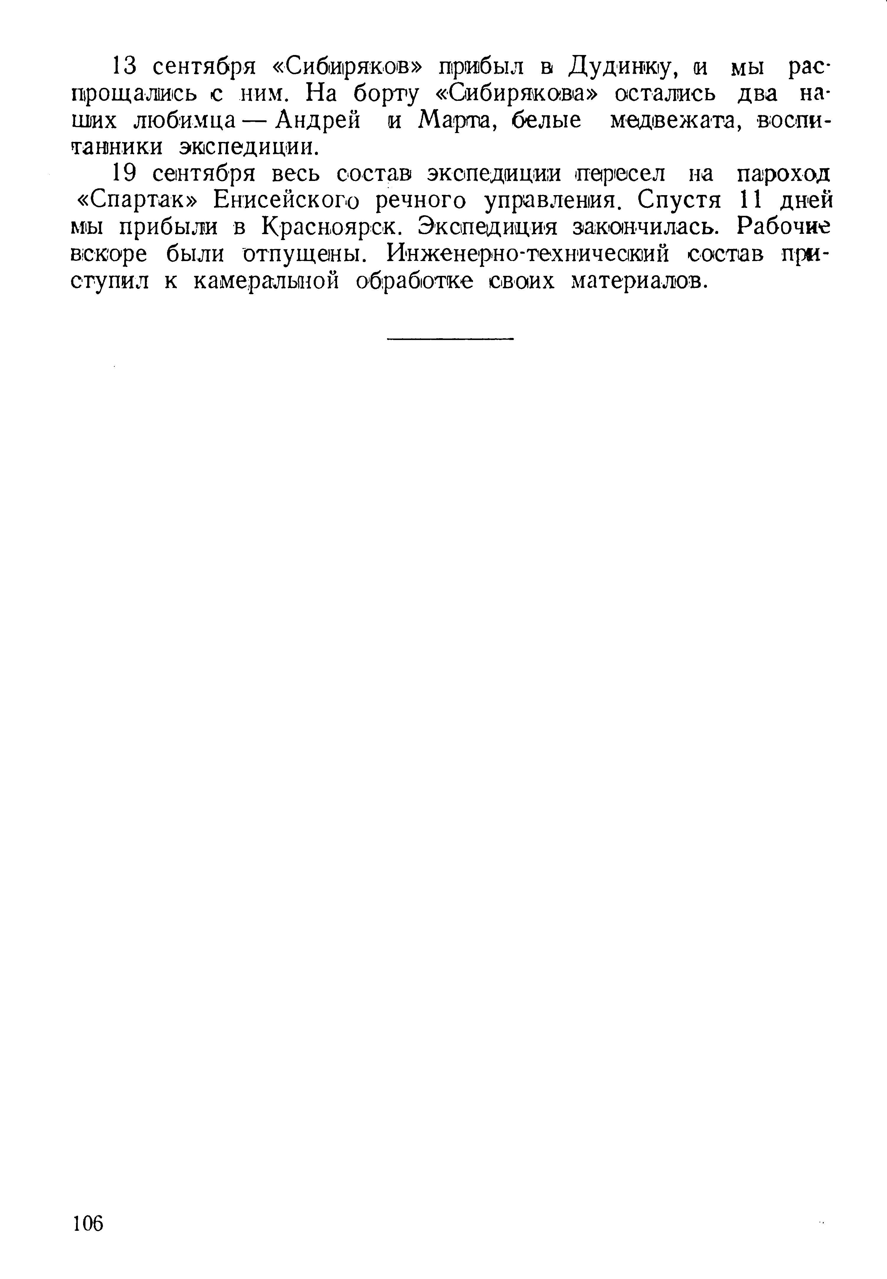 13 сентября «Сибиряков» прибыл в Дудинку, и мы распрощались с ним. На борту «Сибирякова» остались два наших любимца — Андрей и Марта, белые медвежата, воспитанники экспедиции.