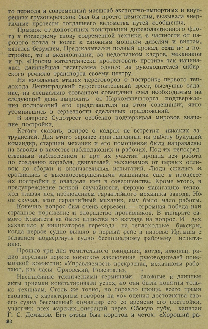 Небезинтересно отметить, что в свое время постройка Комитетом теплоходного флота, который сейчас выполняет колоссальную работу на трех величайших сибирских реках — Оби, Енисее и Лене, — без которого, по существу, успех переломно-