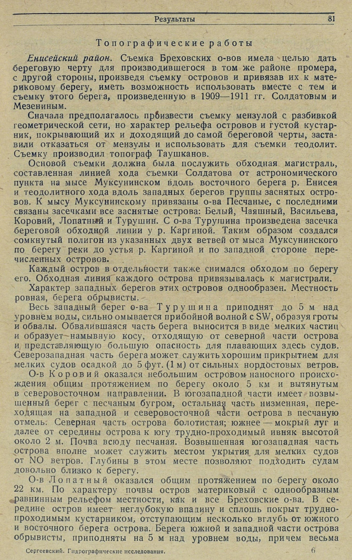 Топографические работыЕнисейский район. Съемка Бреховских о-вов имела целью дать береговую черту для производившегося в том же районе промера, с другой стороны, произведя съемку островов и привязав их к материковому берегу, иметь возможность использовать вместе с тем и съемку этого берега, произведенную в 1909—1911 гг. Солдатовым и Мезениным.