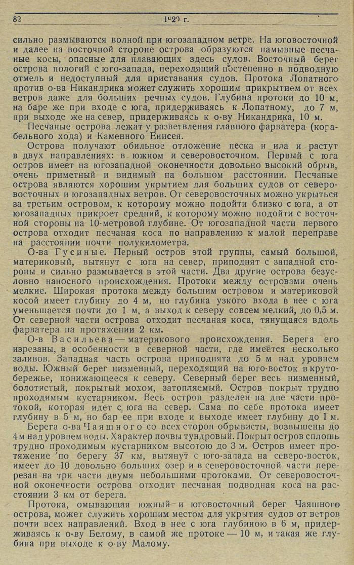 О-ва Гусиные. Первый остров этой группы, самый большой, материковый, вытянут с юга на север, приподнят с западной стороны и сильно размывается в этой части. Два другие острова безусловно наносного происхождения. Протоки между островами очень мелкие. Широкая протока между большим островом и материковой косой имеет глубину до 4 м, но глубина узкого входа в нее с юга уменьшается почти до 1 м, а выход к северу совсем мелкий, до 0, 5 м. От северной части острова отходит песчаная коса, тянущаяся вдоль фарватера на протяжении 2 км.