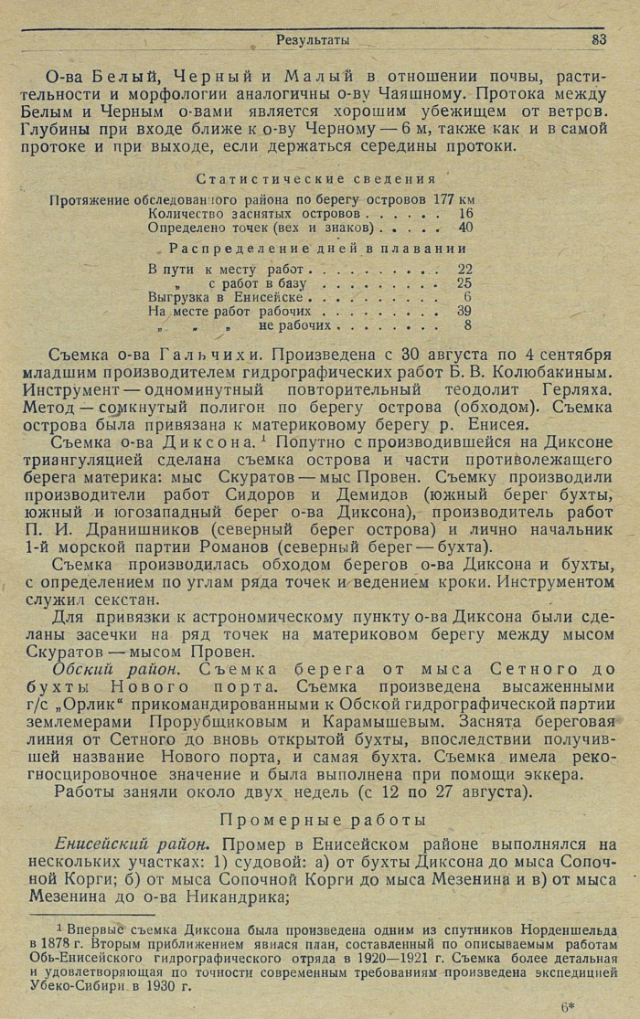 {1} Впервые съемка Диксона была произведена одним из спутников Норденшельда в 1878 г. Вторым приближением явился план, составленный по описываемым работам Обь-Енисейского гидрографического отряда в 1920—1921 г. Съемка более детальная и удовлетворяющая по точности современным требованиям произведена экспедицией Убеко-Сибири в 1930 г.