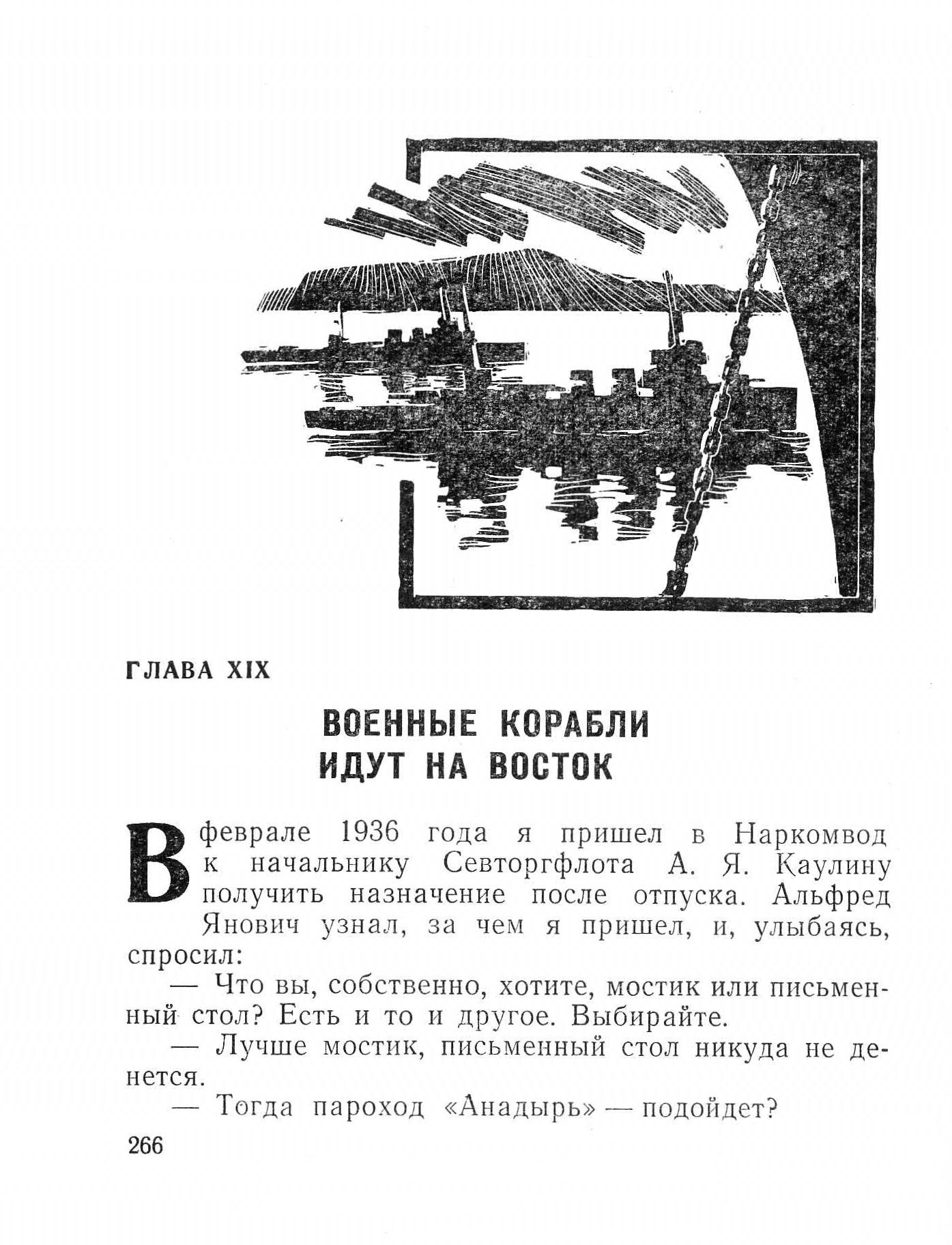 ГЛАВА XIXВОЕННЫЕ КОРАБЛИ ИДУТ НА ВОСТОКВ феврале 1936 года я пришел в Наркомвод к начальнику Совторгфлота А. Я. Каулину получить назначение после отпуска. Альфред Янович узнал, за чем я пришел, и, улыбаясь, спросил: