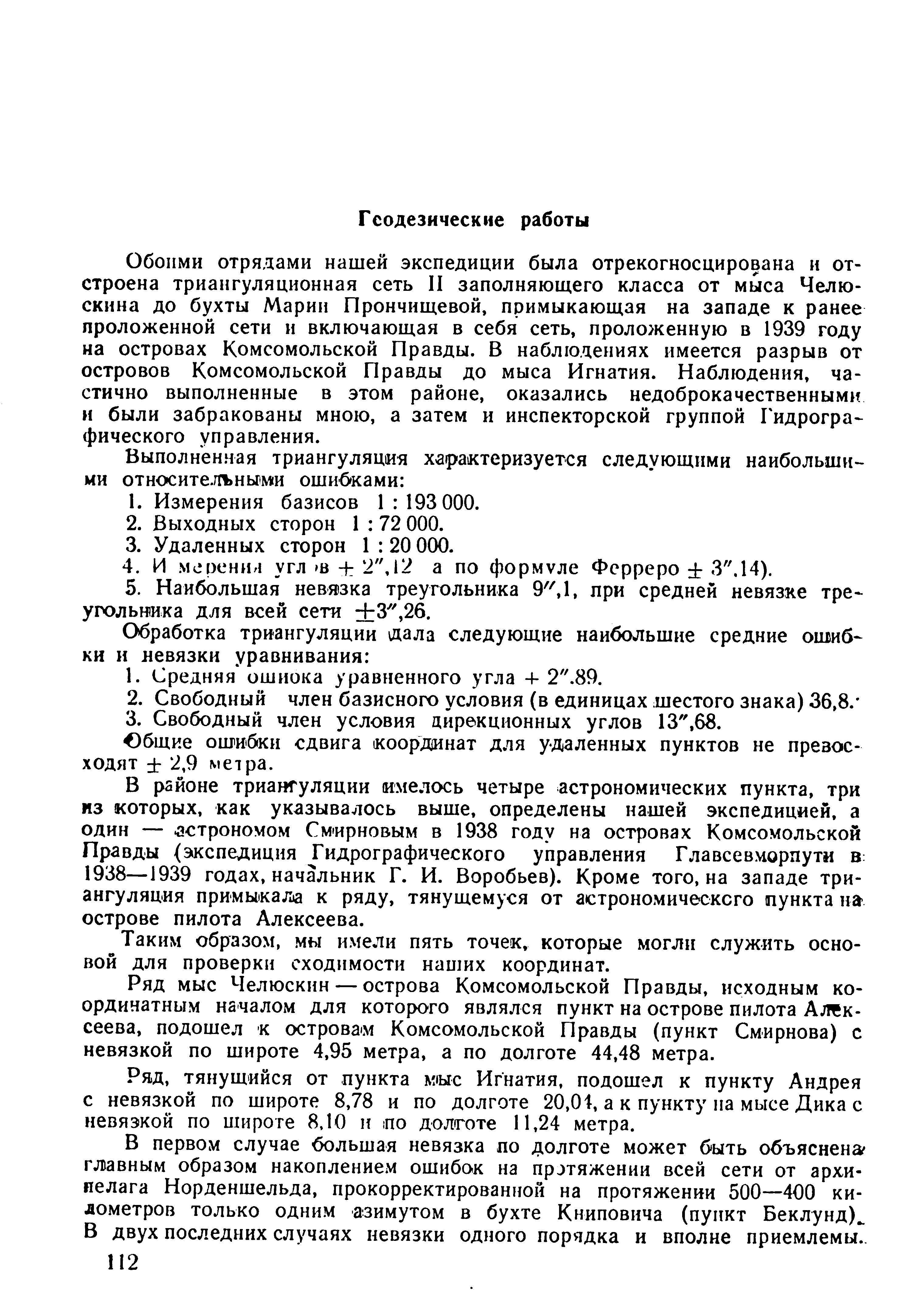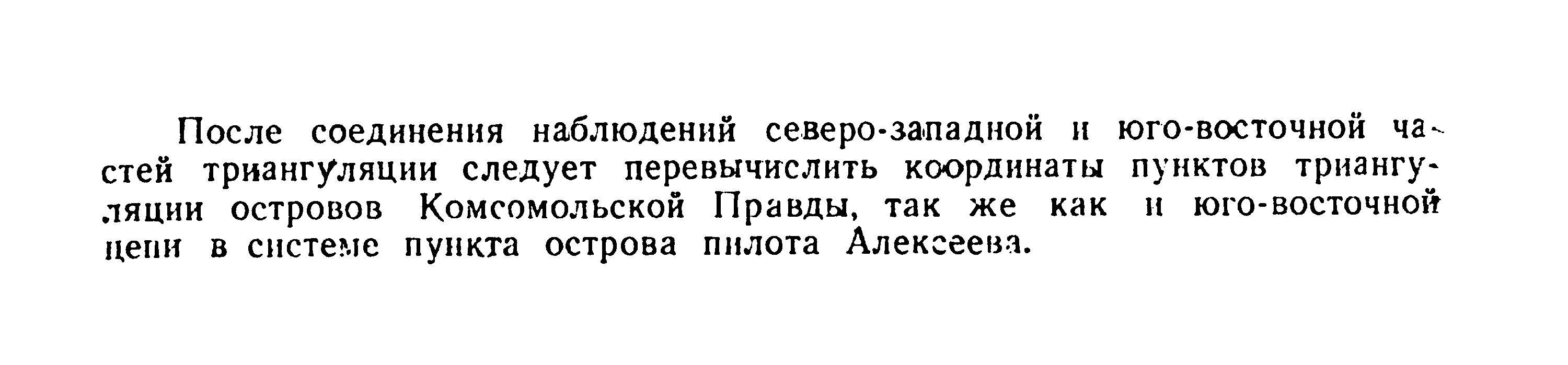 осле соединения наблюдений северо-западной и юго-восточной частей триангуляции следует перевычислить координаты пунктов триангуляции островов Комсомольской Правды, так же как и юго-восточной цепи в системе пункта острова пилота Алексеева.