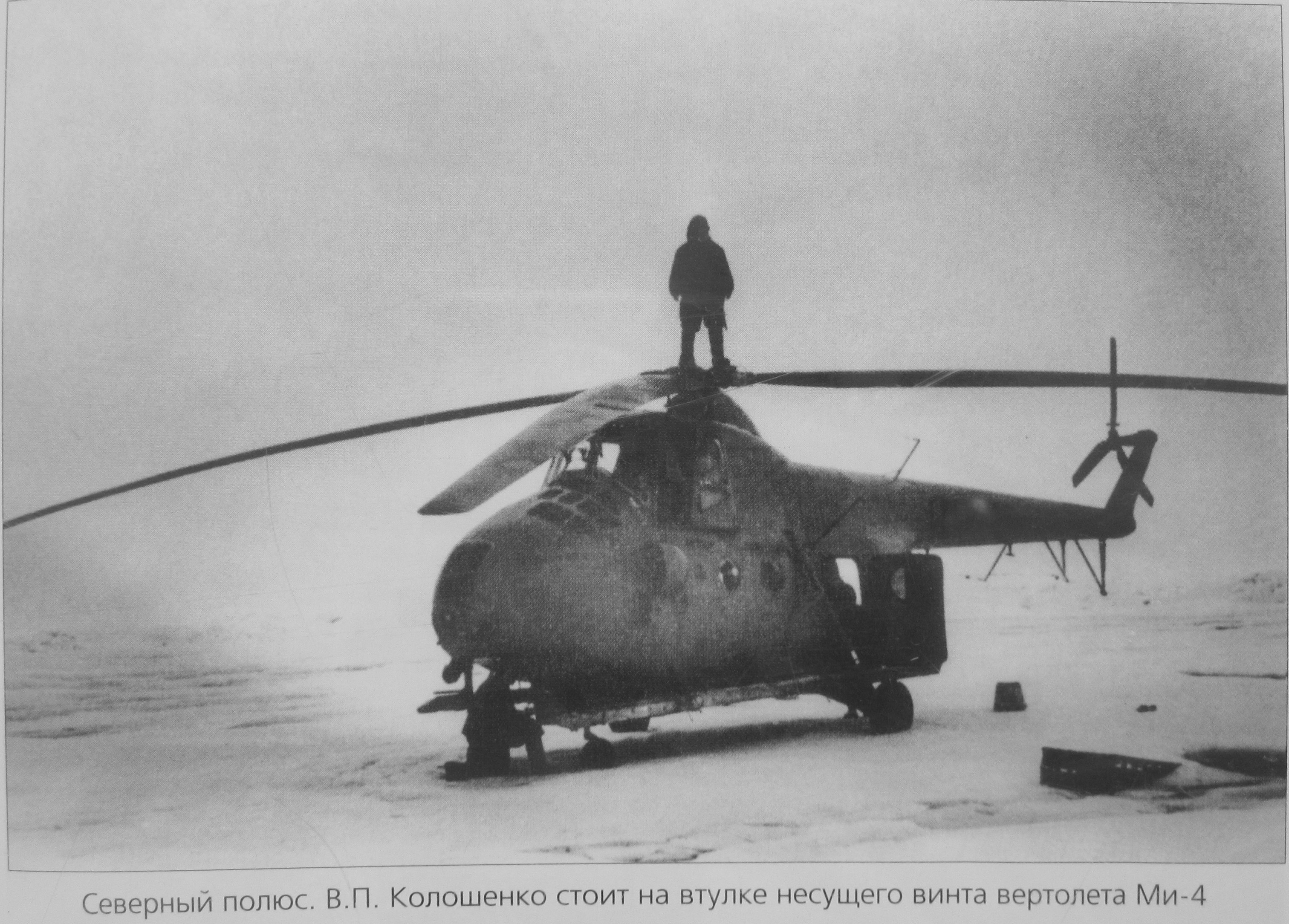 Но несмотря на это мы полетели: заправили горючего в два с лишним раза больше, чем обычно, и взяли курс на Северный полюс. Когда приборы показали, что мы достигли цели, посадили вертолет на льдину. Я взобрался на втулку винта и попросил бортмеханика сделать фотографию. Видимость была очень плохой, и снимок получился нечеткий. Но «исторический» момент был запечатлен, и это главное! Наш вертолет стоял на Северном полюсе, и все меридианы северного полушария Земли сходились к нему!