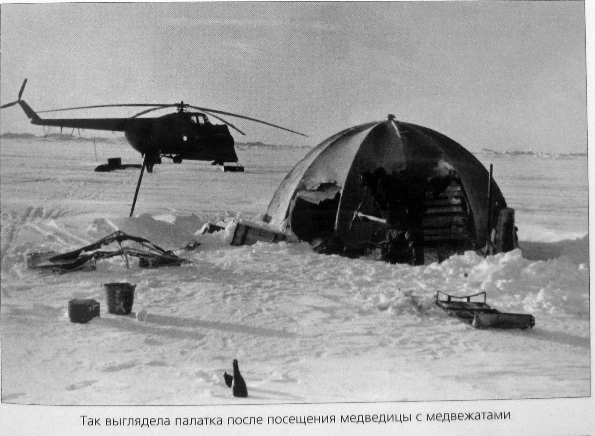 Надо сказать, что белые медведи навещали нас не раз. Один молодой медведь постоянно «пасся» вблизи места, куда мы уносили пищевые отходы. Были случаи, когда белые медведи заходили и в наш лагерь и мы вынуждены были отгонять непрошеных гостей самыми разными способами. Самым эффективным, как показала практика, был запуск вертолетного двигателя...