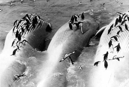 В бинокль отчетливо просматривались полосы сплошных ледяных полей с вмерзшими в лед громадами айсбергов. Пошли ко льдам в надежде встретить блювалов, они любят резвиться среди айсбергов, но китов не было, с припая глядели на них моржи. "Лед — 10 баллов, толщиной 20-25 см", — писали в вахтенных журналах. Китовые стада стремились на север. Вслед за ними снялась к Фолклендским островам и флотилия. По пути "Слава-1" бросила якорь на рейде норвежской фактории Гритвикен в Южной Георгии. Переселенные из Норвегии в Антарктику саами пасли оленей, под ногами у рогатых парнокопытных путались беспечные пингвины. Увидели зеленую траву. Норвежские инструкторы балаболили с одичавшими земляками. "Бэйз-командер" показал снимок из американской газеты. Группа парней пересекла на плоту Тихий океан. В экспедиции были норвежцы Тур Хейердал, радист Бьерн Стайб. Радист впоследствии сопьется на полярных станциях.