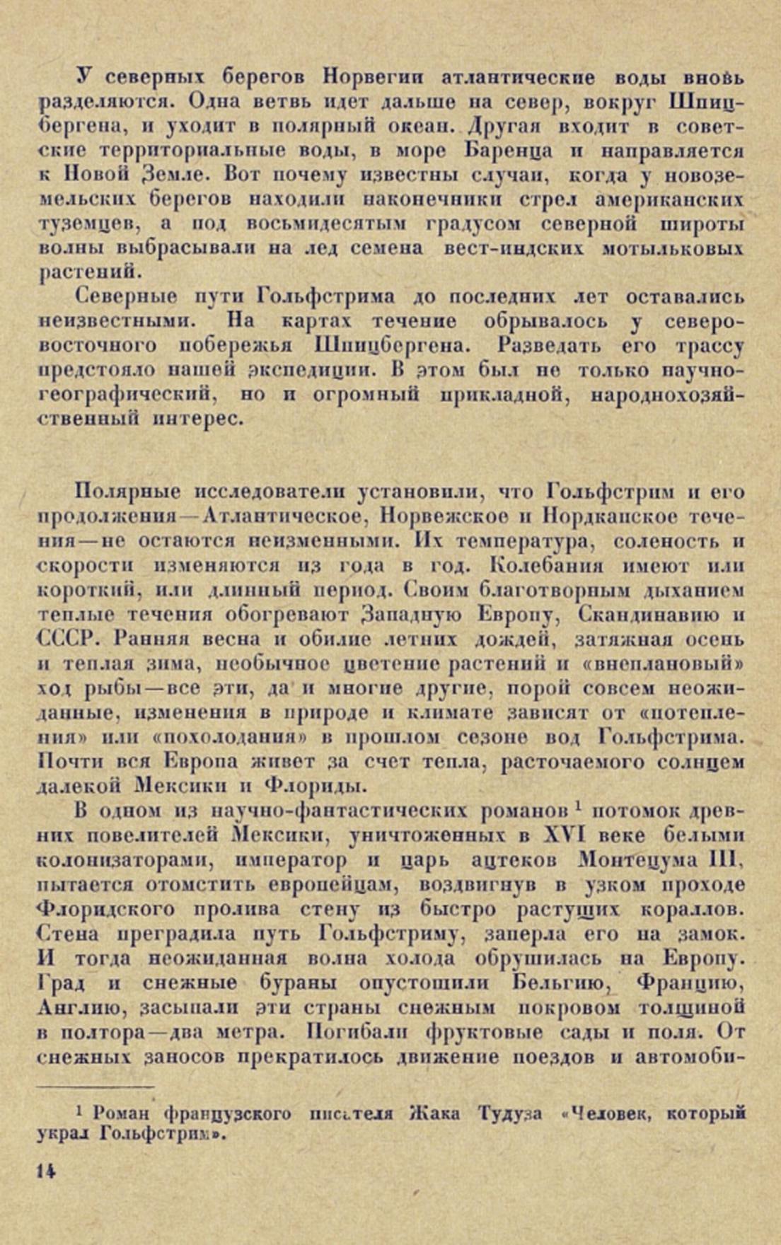 1 Ученые не считают возможным называть эти теплые воды именем Гольфстрима. В самом деле, великая океаническая река, начавшаяся у берегов Флориды, вбирает в себя но дороге немало многоводных потоков. Воды, приходящие в Гренландское море, принято называть теплым Атлантическим течением, и только условно, с некоторыми погрешностями против истины, мы позволили себе кое-где называть их водами Гольфстрима.[13]
