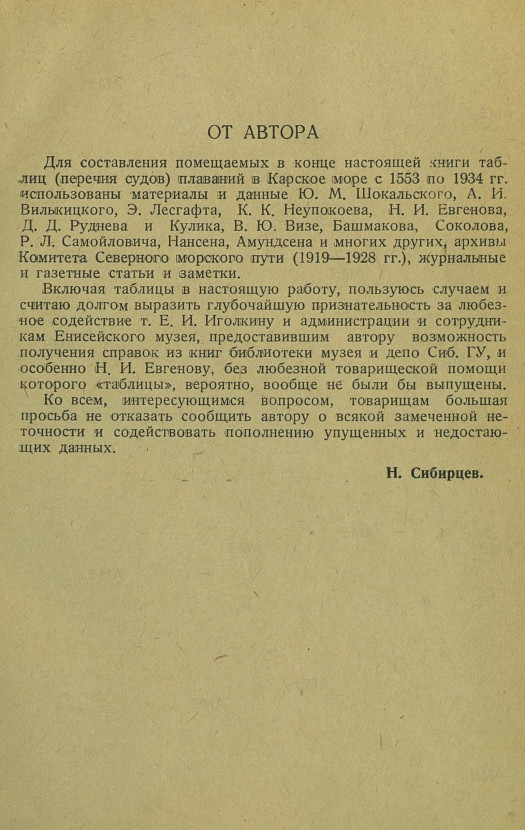 Для составления помещаемых в конце настоящей книги таблиц (перечня судов) плаваний в Карское море с 1553 по 1934 гг. использованы материалы и данные Ю. М. Шокальского, А. И. Вилькицкого, Э. Лесгафта, К. К. Неупокоева, Н. И. Евгенова, Д. Д. Руднева и Кулика, В. Ю. Визе, Башмакова, Соколова, Р. Л. Самойловича, Нансена, Амундсена и многих других, архивы Комитета Северного морского пути (1919—1928 гг. ), журнальные и газетные статьи и заметки.