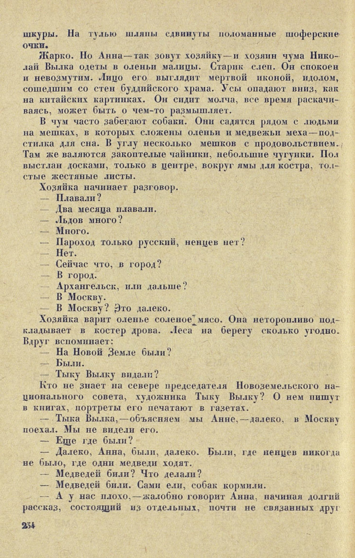 Жарко. Но Анна — так зовут хозяйку — и хозяин чума Николай Вылка одеты в оленьи малицы. Старик слеп. Он спокоен и невозмутим. Лицо его выглядит мертвой иконой, идолом, сошедшим со стен буддийского храма. Усы опадают вниз, как на китайских картинках. Он сидит молча, все время раскачиваясь, может быть о чем-то размышляет.