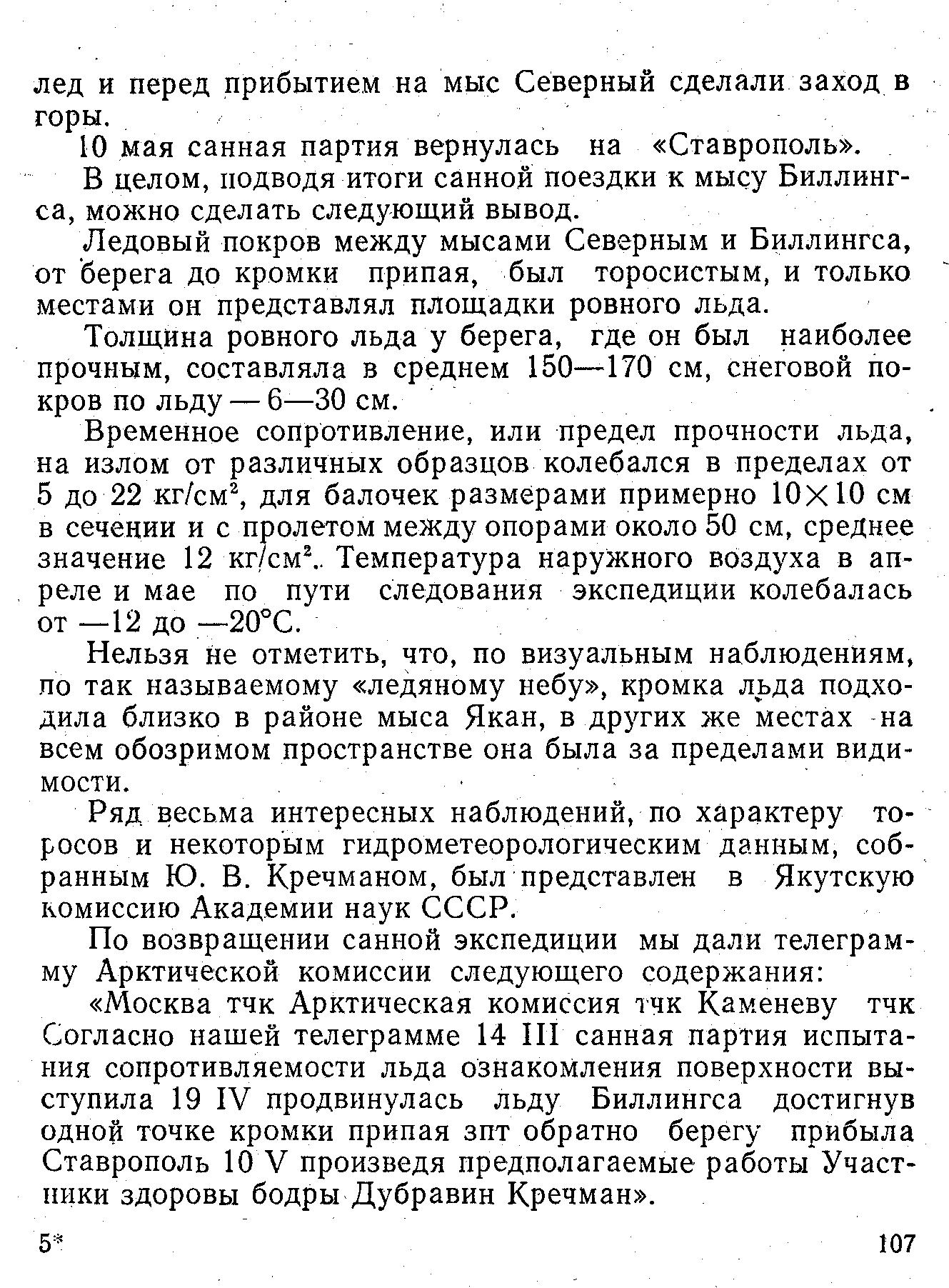 щего содержания: «Испытания сопротивляемости льда ознакомления его поверхности других научных целей организуется санная экспедиция мыс Биллингса. Выход предполагаем апреле. Студент ЛКИ Дубравин, метеоролог Kpечман».