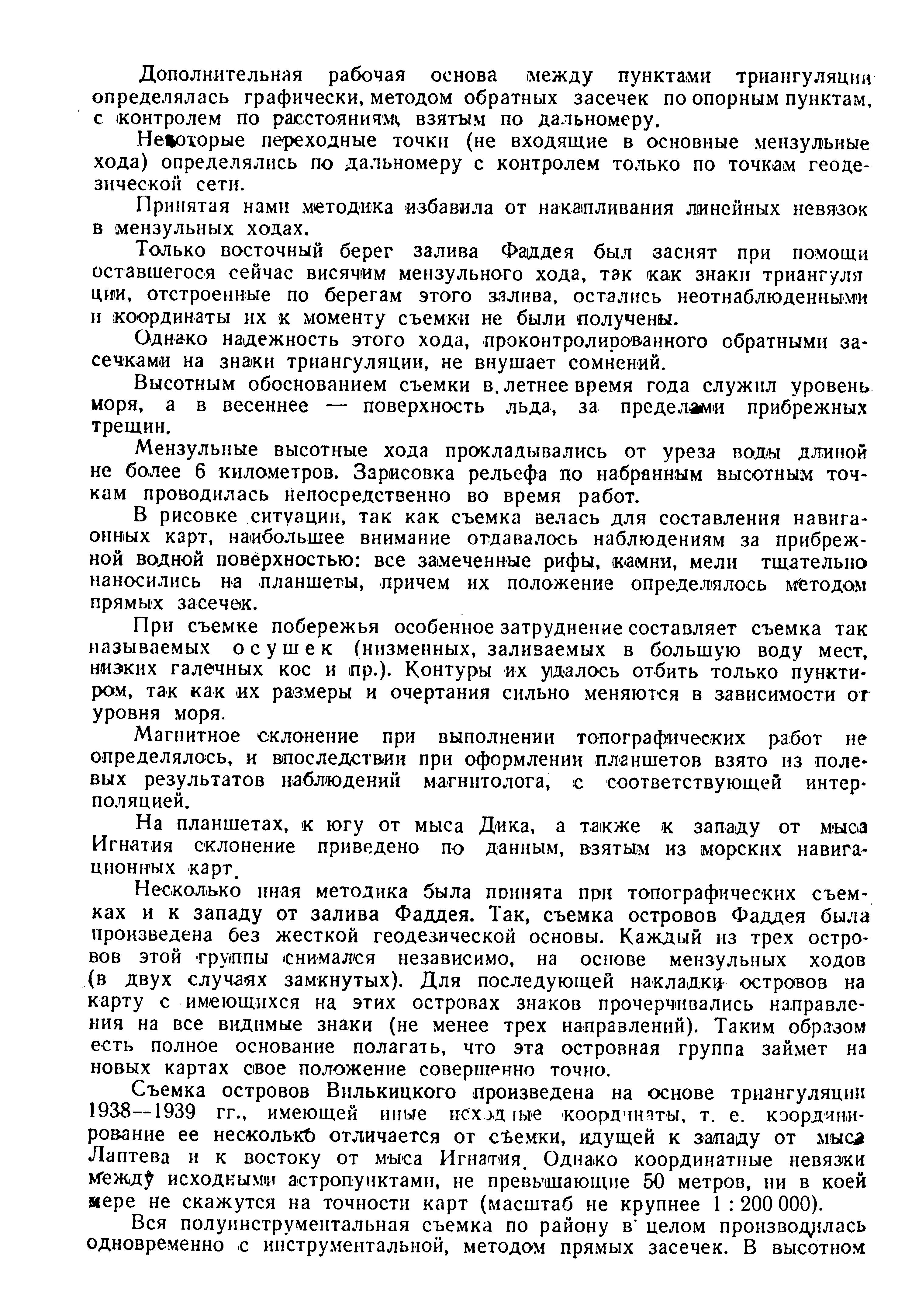 Несколько иная методика была принята при топографических съемках и к западу от залива Фаддея. Так, съемка островов Фаддея была произведена без жесткой геодезической основы. Каждый из трех островов этой труппы снимался независимо, на основе мензульных ходов (в двух случаях замкнутых). Для последующей накладки островов на карту с имеющихся на этих островах знаков прочерчивались направления на все видимые знаки (не менее трех направлений). Таким образом есть полное основание полагать, что эта островная группа займет на новых картах свое положение совершенно точно.