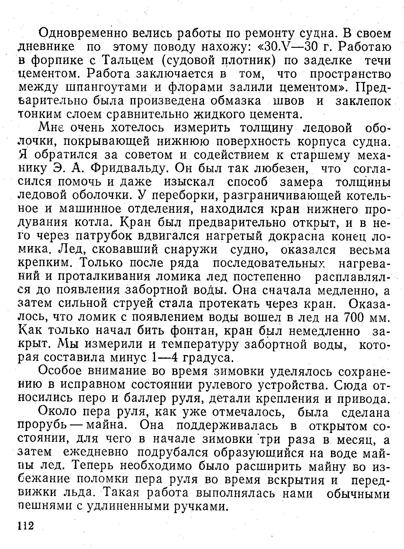 Мне очень хотелось измерить толщину ледовой оболочки, покрывающей нижнюю поверхность корпуса судна. Я обратился за советом и содействием к старшему механику Э. А. Фридвальду. Он был так любезен, что согласился помочь и даже изыскал способ замера толщины ледовой оболочки. У переборки, разграничивающей котельное и машинное отделения, находился кран нижнего продувания котла. Кран был предварительно открыт, и в него через патрубок вдвигался нагретый докрасна конец ломика. Лед, сковавший снаружи судно, оказался весьма крепким. Только после ряда последовательных нагреваний и проталкивания ломика лед постепенно расплавлялся до появления забортной воды. Она сначала медленно, а затем сильной струей стала протекать через кран. Оказалось, что ломик с появлением воды вошел в лед на 700 мм. Как только начал бить фонтан, кран был немедленно закрыт. Мы измерили и температуру забортной воды, которая составила минус 1—4 градуса.