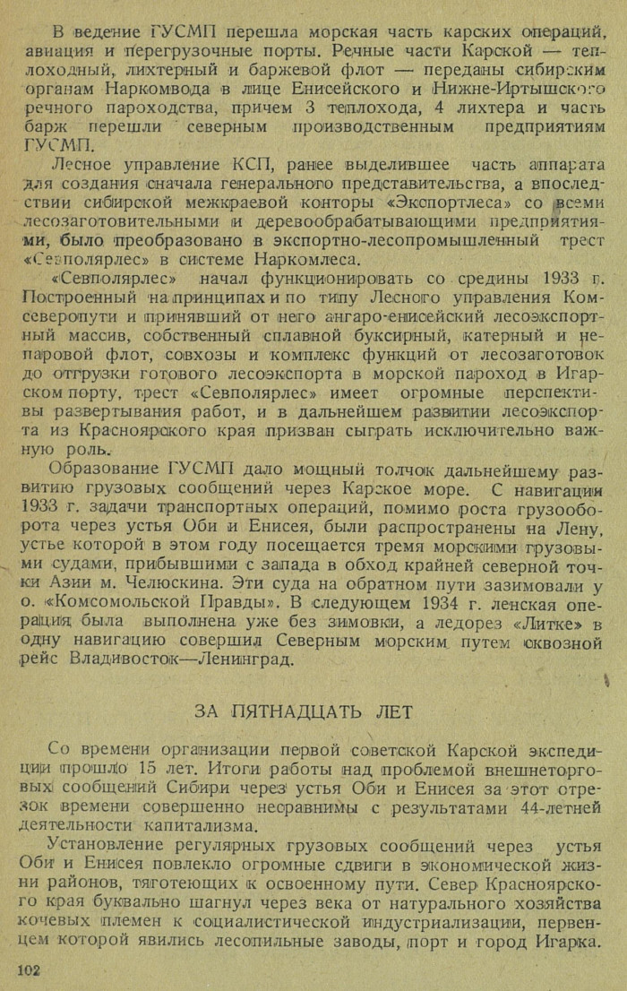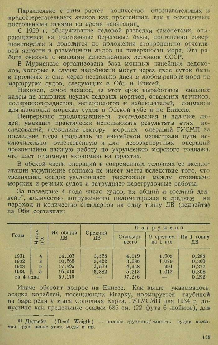 Непрерывно продолжавшиеся исследования и наличие людей, умевших практически использовать результаты этих исследований, позволили сектору морских операций ГУСМП за последние годы проделать на енисейской магистрали пути исключительно ответственную и для лесоэкспортных операций чрезвычайно важную работу по укрупнению морского тоннажа, что дает огромную экономию на фрахтах.