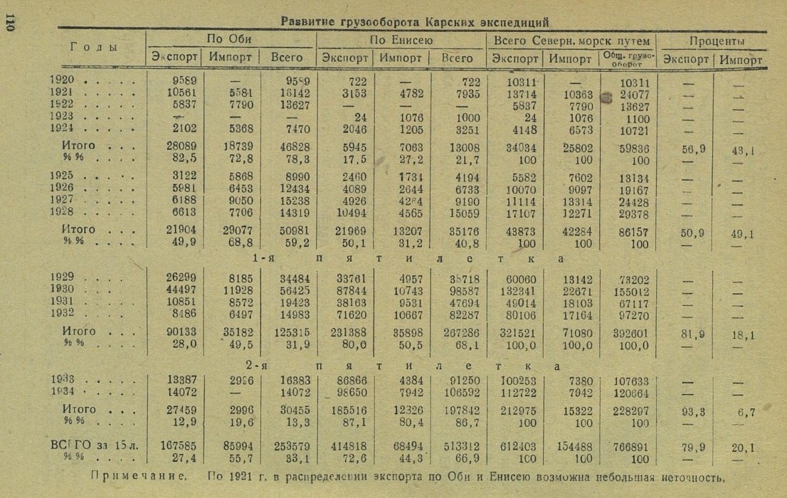 4 года пятилетки экспорт с Оби увеличился в 4 раза сравнительно с предыдущим четырехлетием, экспорт с Енисея возрос более, чем в 10 раз. Удельный вес Оби упал до 28 проц. в экспорте и 32 проц. в грузообороте. Это явление продолжает иметь место и за 2 истекших года второй пятилетки, в течение которых преобладание Енисея в экспорте и грузообороте становится еще более значительным.