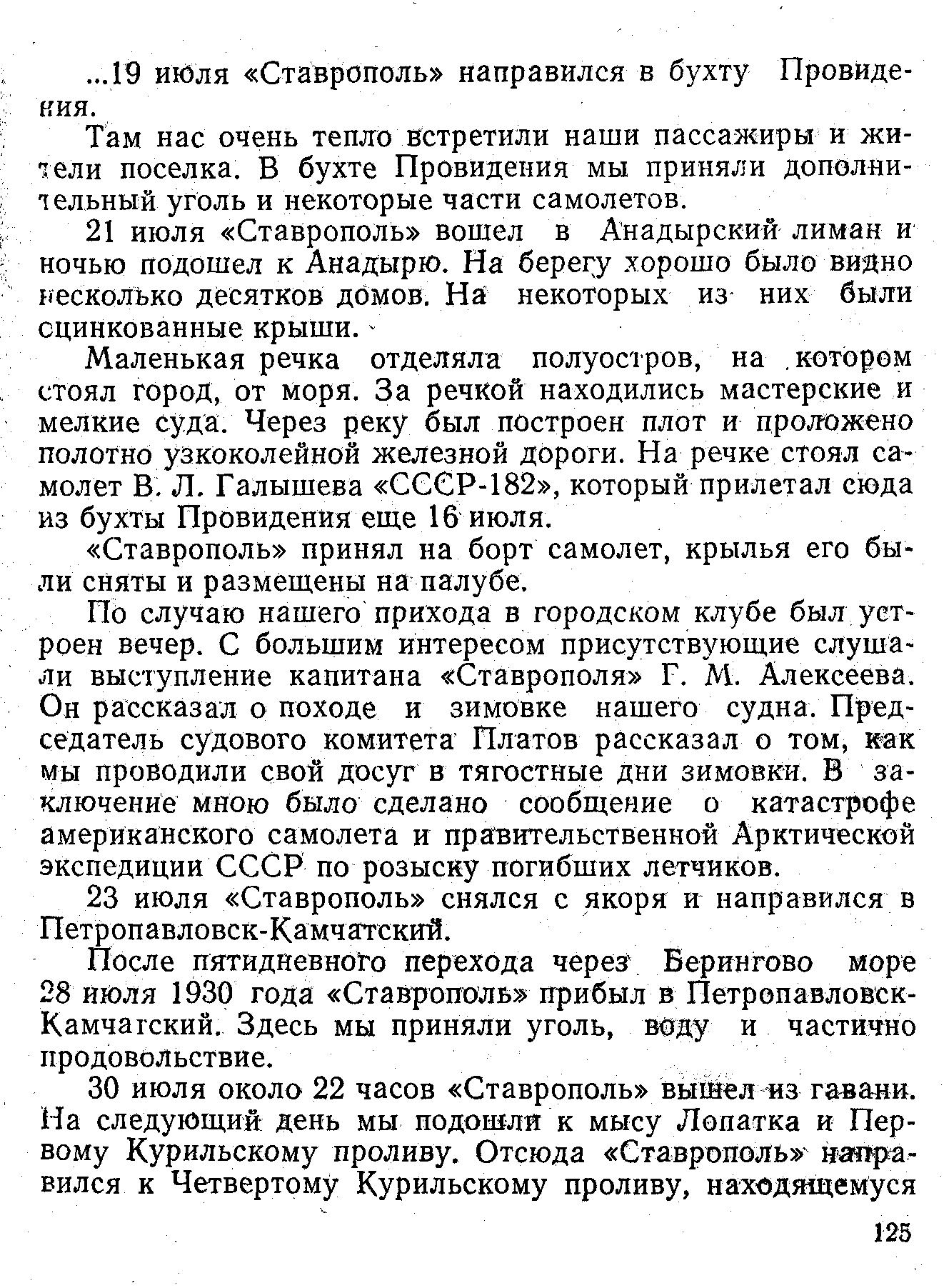 21 июля «Ставрополь» вошел в Анадырский лиман и ночью подошел к Анадырю. На берегу хорошо было видно несколько десятков домов. На некоторых из них были сцинкованные крыши. Маленькая речка отделяла полуостров, на котором стоял город, от моря. За речкой находились мастерские и мелкие суда. Через реку был построен плот и проложено полотно узкоколейной железной дороги. На речке стоял самолет В. Л. Галышева «СССР-182», который прилетал сюда из бухты Провидения еще 16 июля.