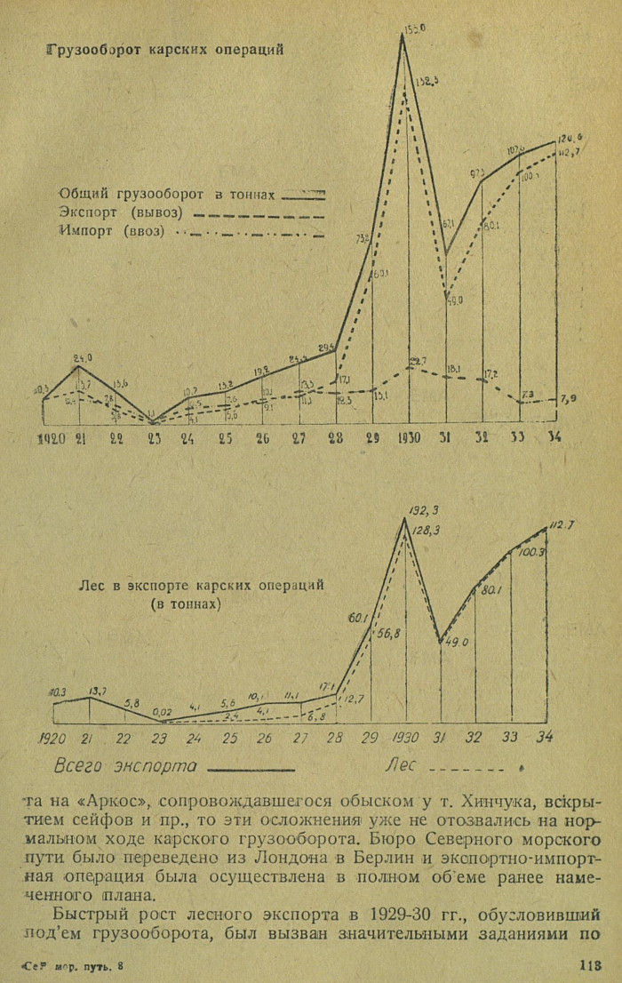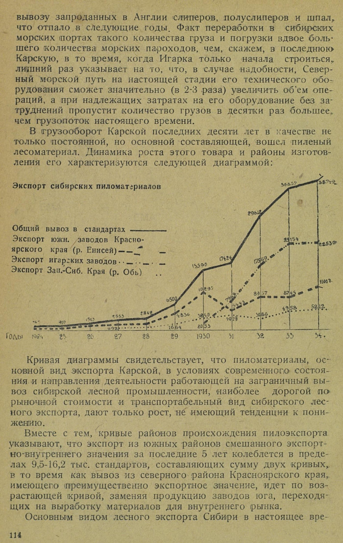 вывозу запроданных в Англии слиперов, полуслиперов и шпал, что отпало в следующие годы. Факт переработки в сибирских морских тортах такого количества груза и погрузки вдвое большего количества морских пароходов, чем, скажем, в последнюю Карскую, в то время, когда Игарка только начала строиться,, лишний раз указывает на то, что, в случае надобности, Северный морской путь на настоящей стадии его технического оборудования сможет значительно (в 2-3 раза) увеличить объем операций, а при надлежащих затратах на его оборудование без затруднений пропустит количество грузов в десятки раз большее, чем грузопоток настоящего времени.