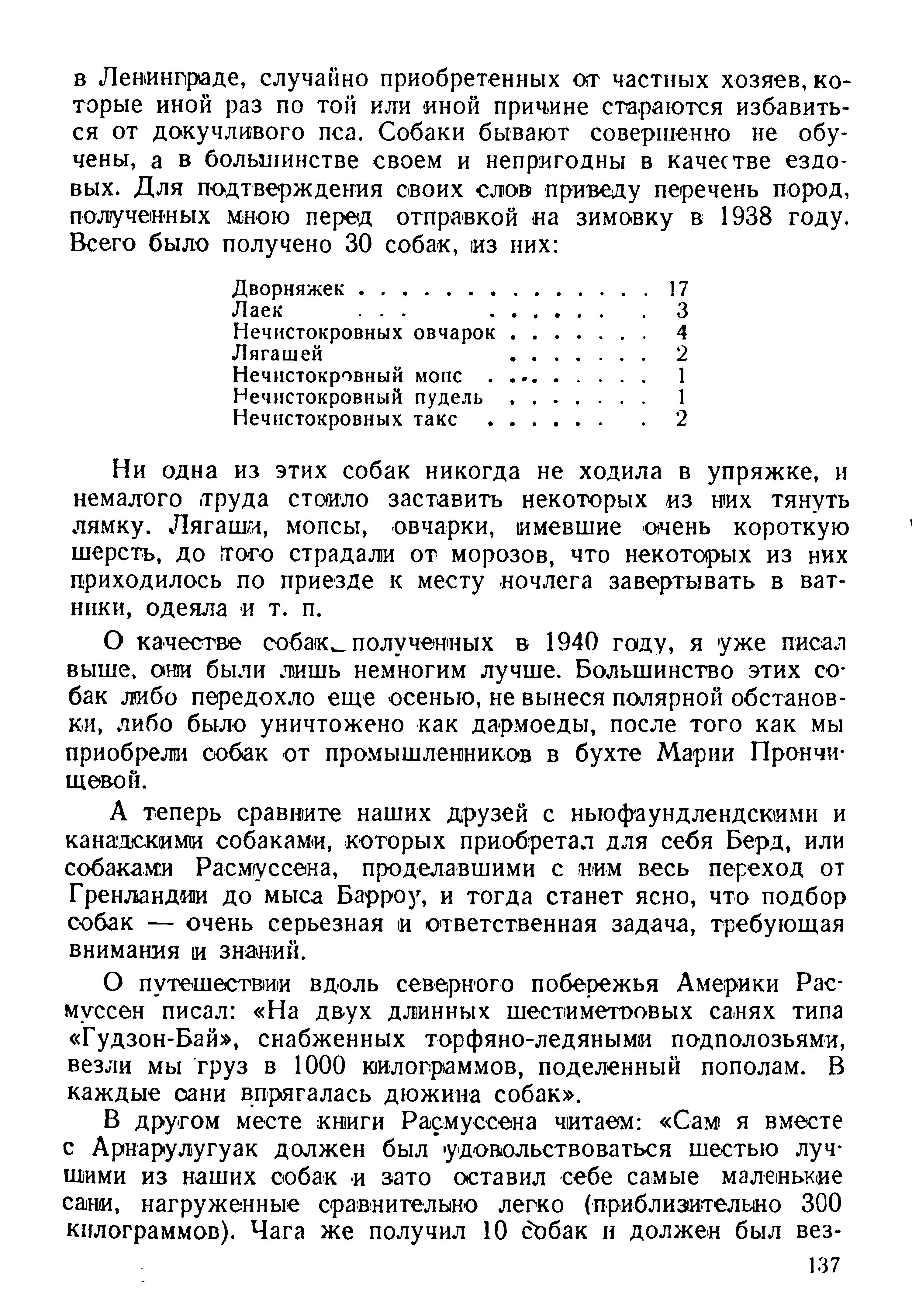 в Ленинграде, случайно приобретенных от частных хозяев, которые иной раз по той или иной причине стараются избавиться от докучливого пса. Собаки бывают совершенно не обучены, а в большинстве своем и непригодны в качестве ездовых. Для подтверждения своих слов приведу перечень пород, полученных мною перед отправкой на зимовку в 1938 году. Всего было получено 30 собак, из них: