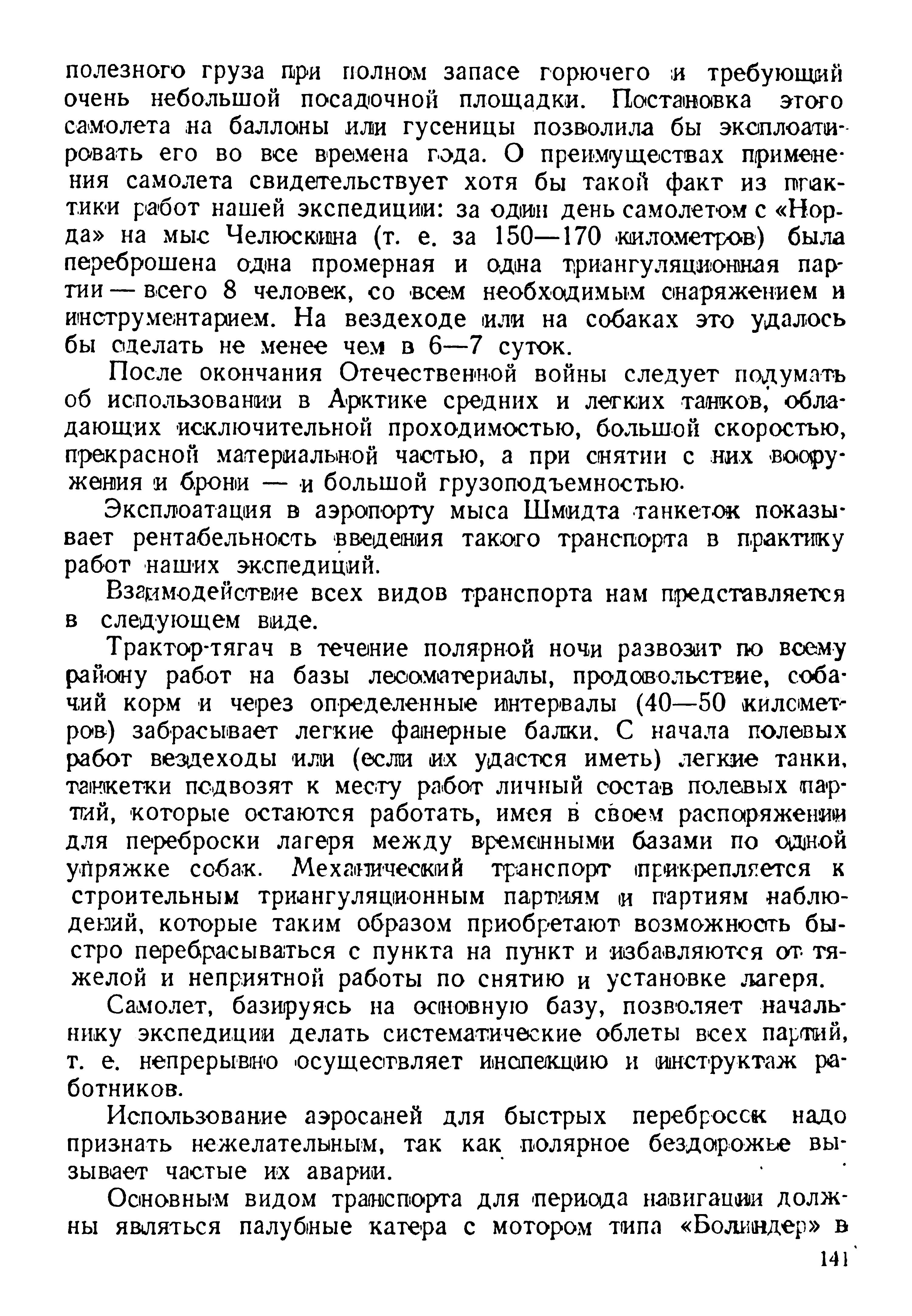 полезного груза при полном запасе горючего и требующий очень небольшой посадочной площадки. Постановка этого самолета на баллоны или гусеницы позволила бы эксплоатировать его во все времена года. О преимуществах применения самолета свидетельствует хотя бы такой факт из практики работ нашей экспедиции: за один день самолетом с «Норда» на мыс Челюскина (т. е. за 150—170 километров) была переброшена одна промерная и одна триангуляционная партии — всего 8 человек, со всем необходимым снаряжением и инструментарием. На вездеходе или на собаках это удалось бы сделать не менее чем в 6—7 суток.