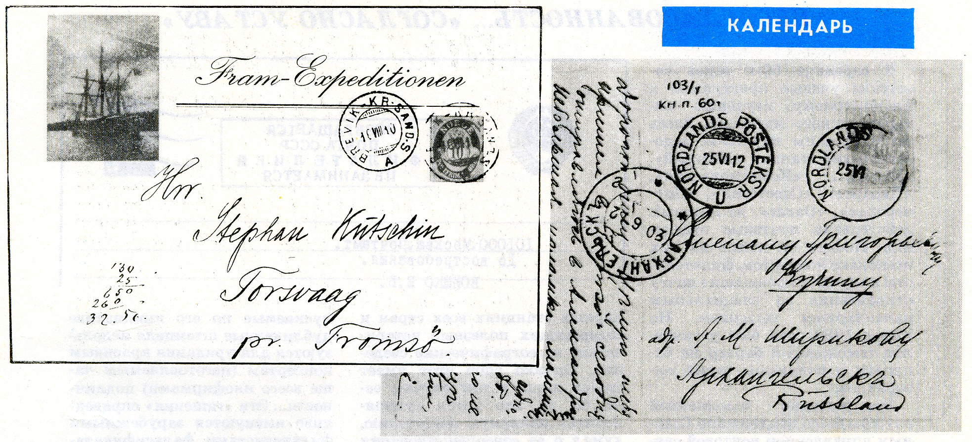 Вот письмо, отправленное на «Фрам» из Онеги 16.06.1910 года. Оно зафиксировало несколько переадресовок: сначала тушью было написано «Кристиания. До востребования», затем проставлен другой пункт — «Кристиансанд». Потом оба адреса были зачеркнуты, и левее карандашом выведен новый (с именем Амундсена), который также зачеркнут, а внизу появился еще один — «Биологическая станция. Берген». Несмотря на столько «переадресовок», это письмо все же было доставлено А. Кучину и именно в тот пункт, где находился тогда «Фрам». Это подтверждают штемпеля: «Кристиания. 5.VII.10» и «Кристиансанд. 8.07. (19 ч.). Ю».
