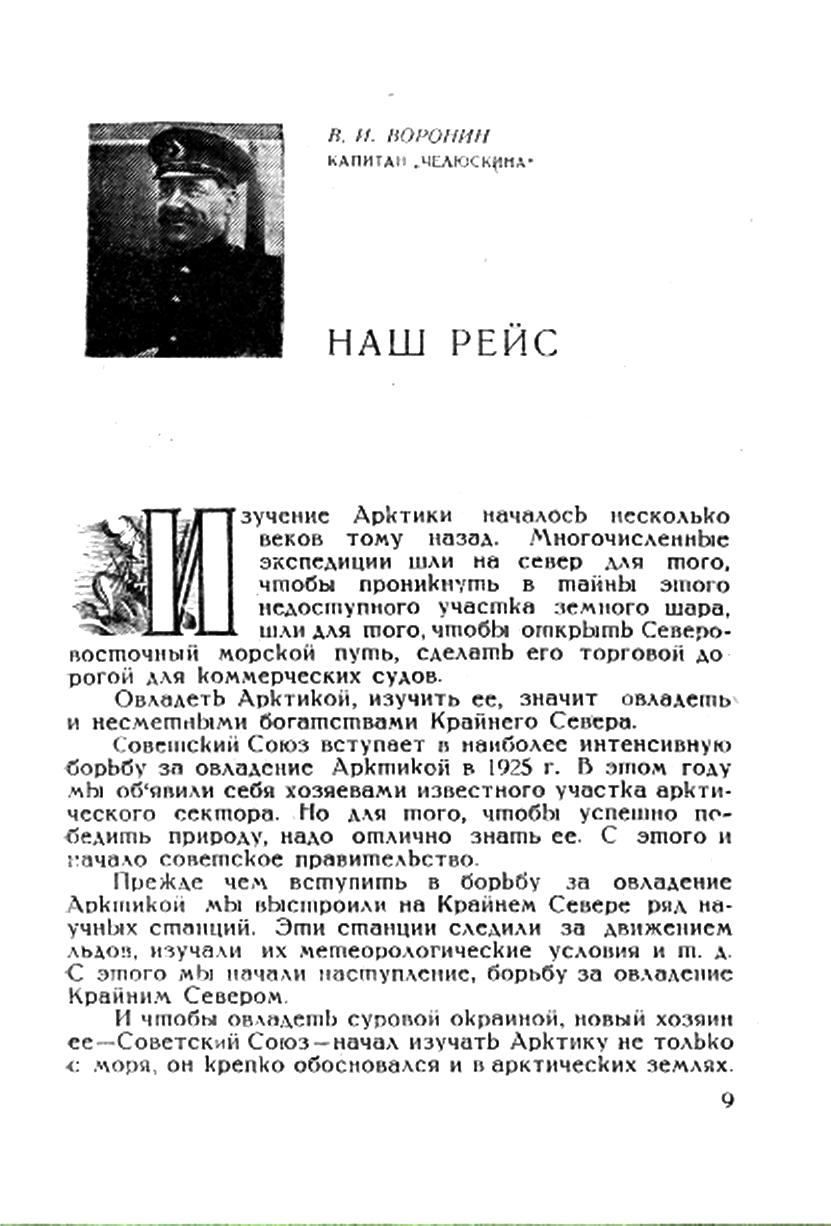 Снабжать товарами людей, населяющих земли советской Арктики, необходимо и впредь. Сюда морем нужно забрасывать громадное количество грузов. И нужно не мешкать с освоением Северо-восточного морского пути. Необходимо построить суда такого типа, чтобы они были пригодны для ледового плавания. С этой целью советское правительство организует Управление Северного морского пути. С этой же целью в Дании строится пароход "Челюскин". Назначение "Челюскина" — обслуживать дальневосточную линию Владивосток — Колыма.