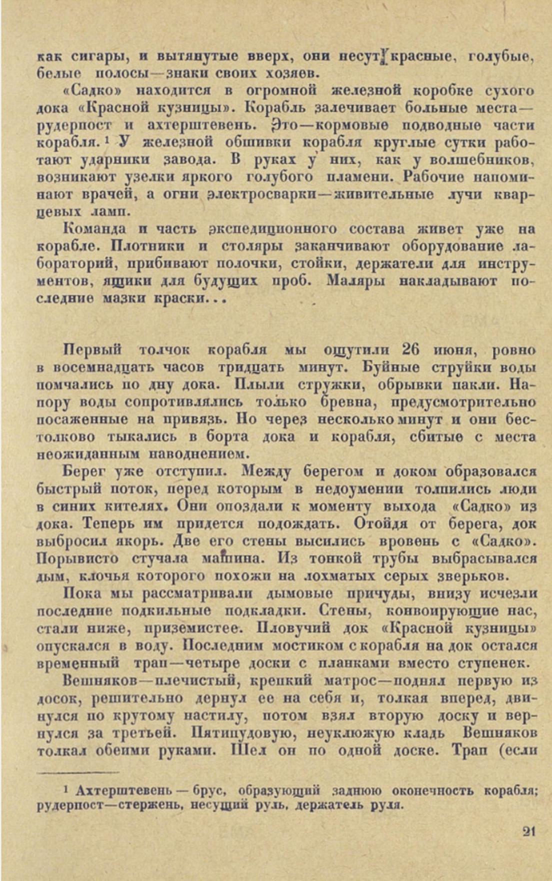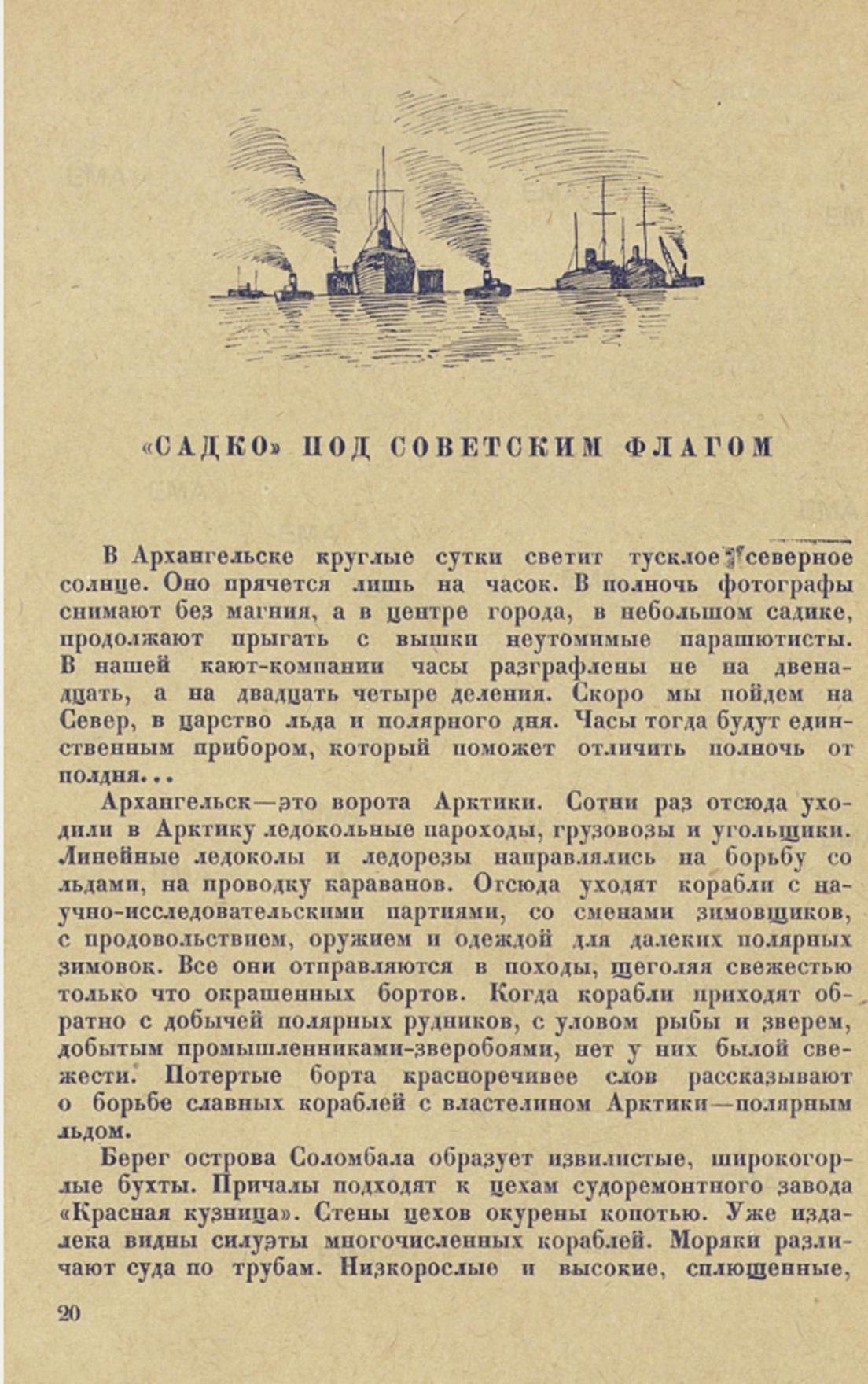 «САДКО» ПОД СОВЕТСКИМ ФЛАГОМВ Архангельске круглые сутки светит тусклое северное солнце. Оно прячется лишь на часок. В полночь фотографы снимают без магния, а в центре города, в небольшом садике, продолжают прыгать с вышки неутомимые парашютисты. В нашей кают-компании часы разграфлены не на двенадцать, а на двадцать четыре деления. Скоро мы пойдем на Север, в царство льда и полярного дня. Часы тогда будут единственным прибором, который поможет отличить полночь от полдня...