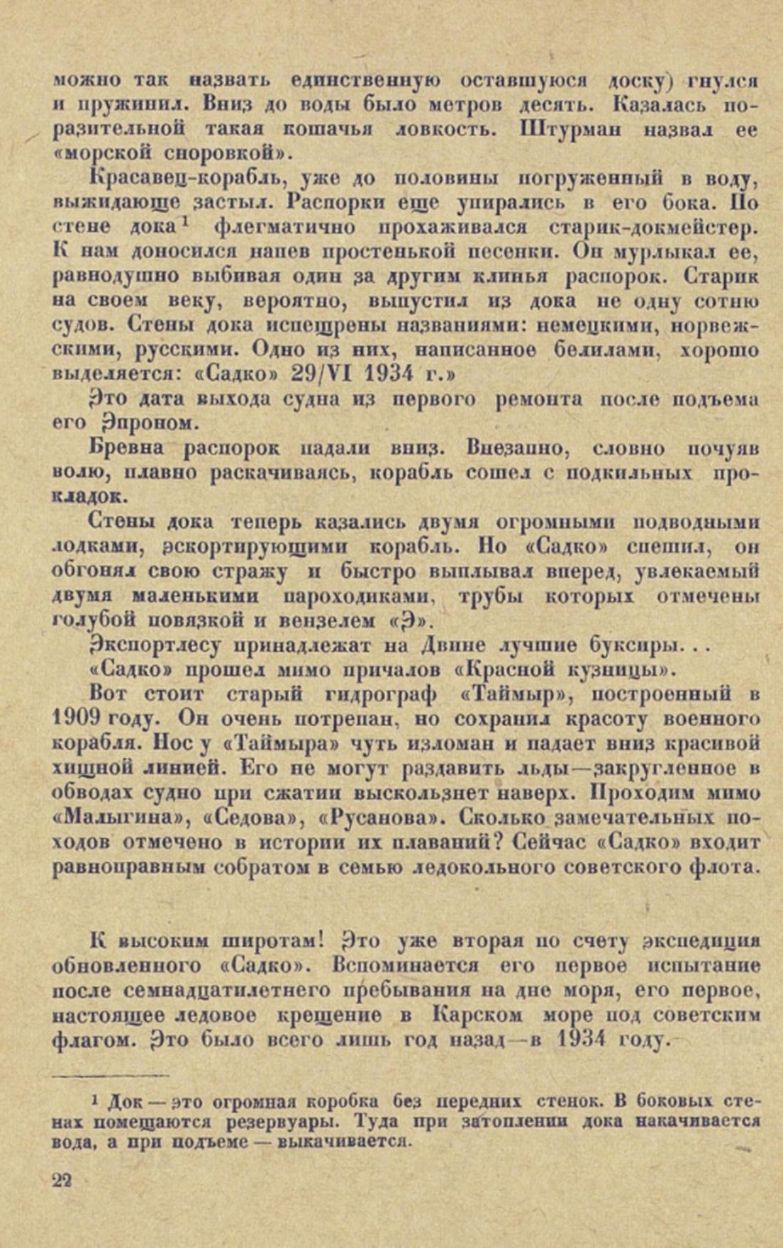 Красавец-корабль, уже до половины погруженный в воду, выжидающе застыл. Распорки еще упирались в его бока. Но стене дока1 флегматично прохаживался старик-докмейстер. К нам доносился напев простенькой песенки. Он мурлыкал ее, равнодушно выбивая один за другим клинья распорок. Старик на своем веку, вероятно, выпустил из дока не одну сотню судов. Стены дока испещрены названиями: немецкими, норвежскими, русскими. Одно из них, написанное белилами, хорошо выделяется: "Садко" 29/VI 1934 г.»