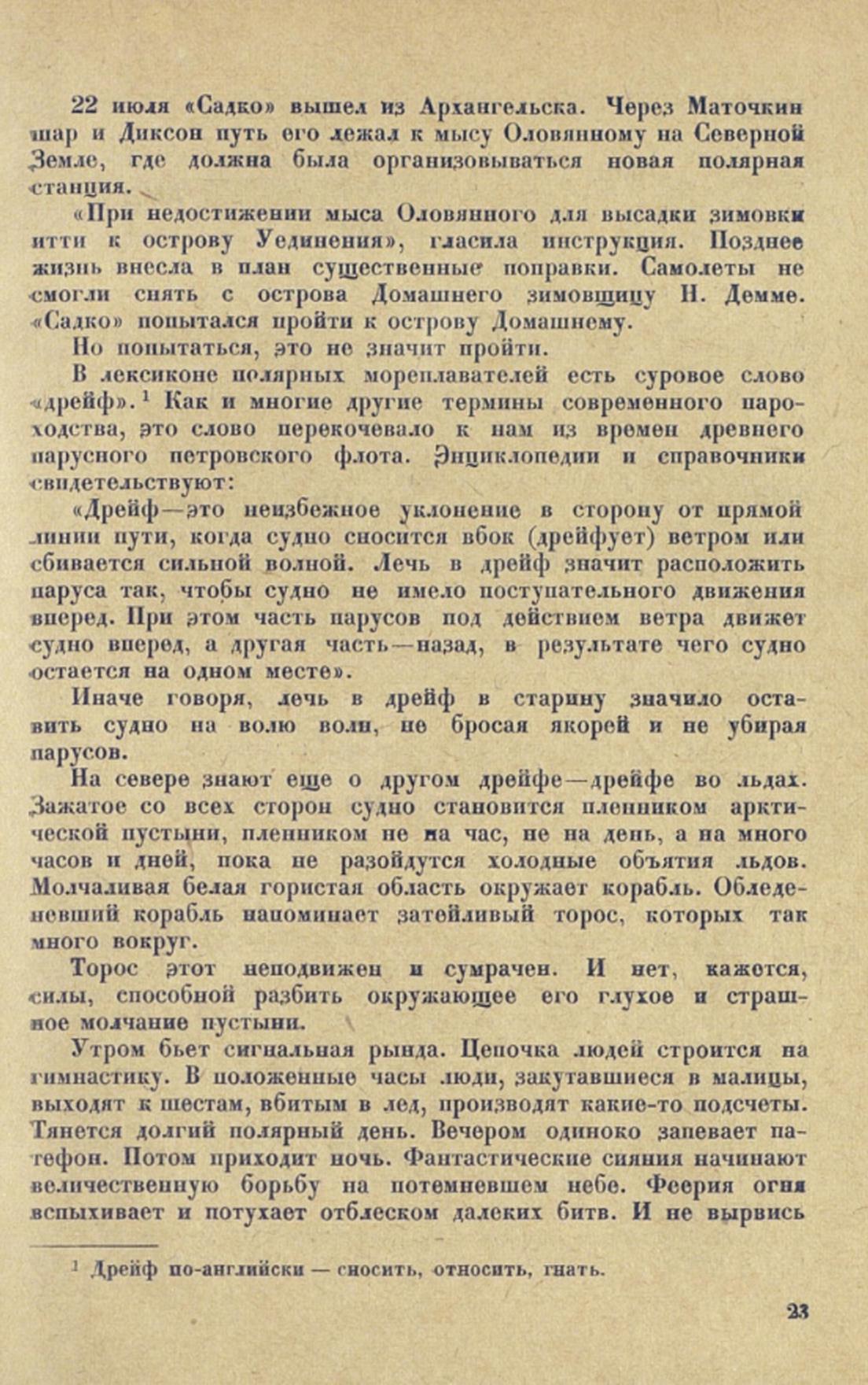 В лексиконе полярных мореплавателей есть суровое слово «дрейф».1 Как и многие другие термины современного пароходства, это слово перекочевало к нам из времен древнего парусного петровского флота. Энциклопедии и справочники свидетельствуют: