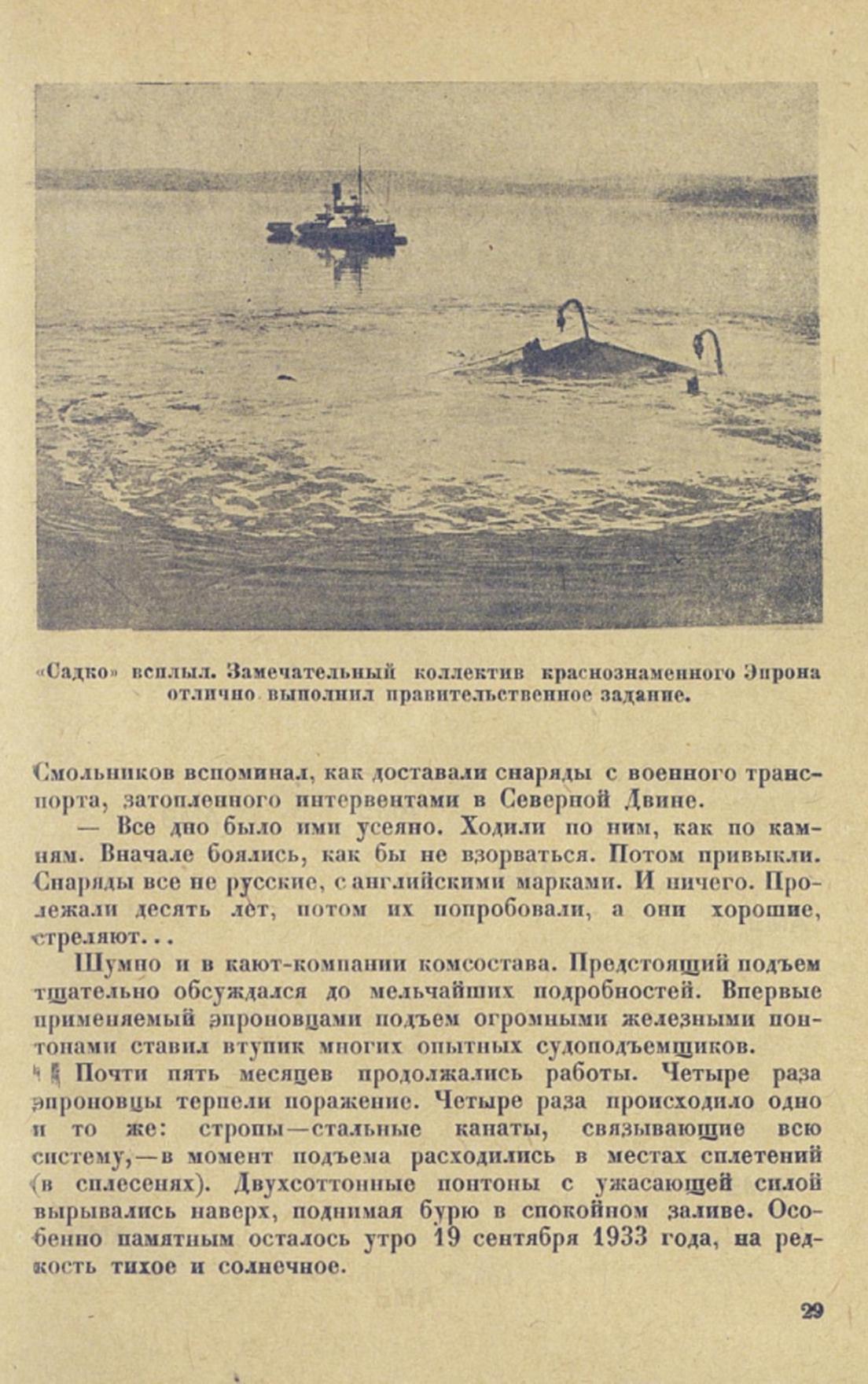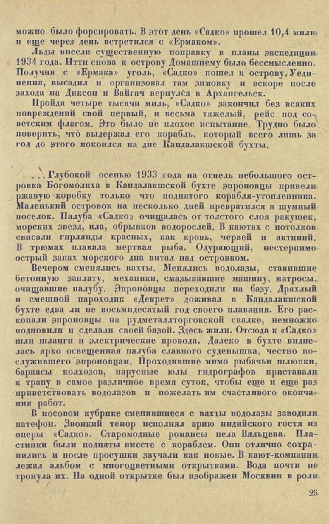 ...Глубокой осенью 1933 года на отмель небольшого островка Богомолиха в Кандалакшской бухте эпроновцы привели ржавую коробку только что поднятого корабля-утопленника. Маленький островок на несколько дней превратился в шумный поселок. Палуба «Садко» очищалась от толстого слоя ракушек, морских звезд, ила, обрывков водорослей. В каютах с потолков свисали гирлянды красных, как кровь, червей и актиний. В трюмах плавала мертвая рыба. Одуряющий, нестерпимо острый запах морского дна витал над островком.