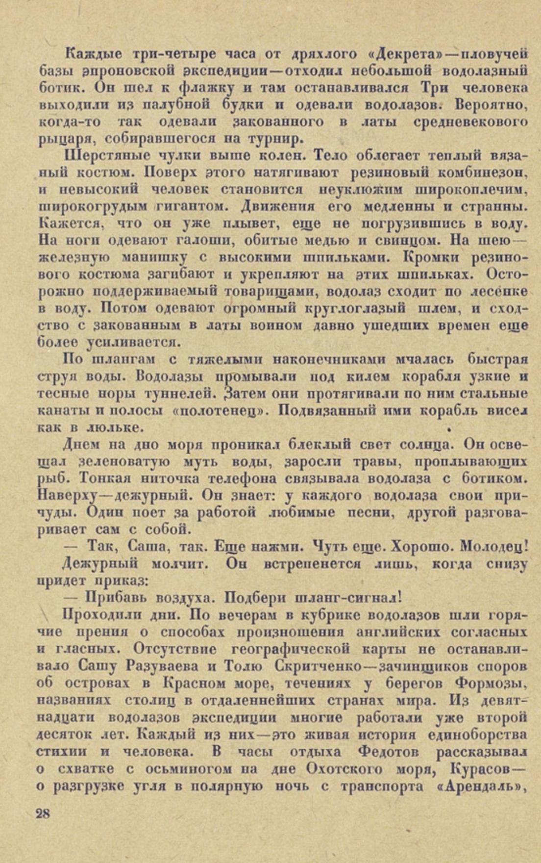 Проходили дни. По вечерам в кубрике водолазов шли горячие прения о способах произношения английских согласных и гласных. Отсутствие географической карты не останавливало Сашу Разуваева и Толю Скритченко — зачинщиков споров об островах в Красном море, течениях у берегов Формозы, названиях столиц в отдаленнейших странах мира. Из девятнадцати водолазов экспедиции многие работали уже второй десяток лет. Каждый из них — это живая история единоборства стихии и человека. В часы отдыха Федотов рассказывал о схватке с осьминогом на дне Охотского моря, Курасов —