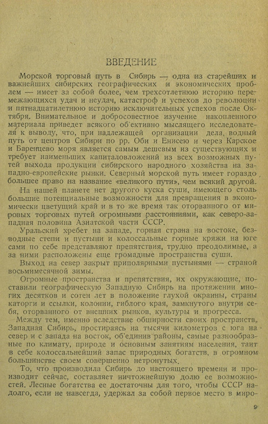 На нашей планете нет другого куска суши, имеющего столь большие потенциальные возможности для превращения в экономически цветущий край и в то же время так оторванного от мировых торговых путей огромными расстояниями, как северо-западная половина Азиатской части СССР.