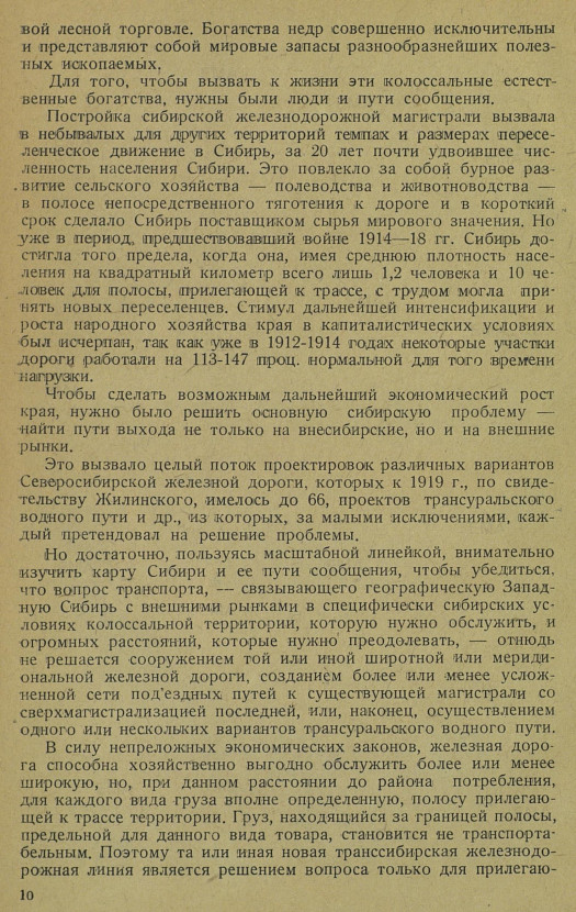 Постройка сибирской железнодорожной магистрали вызвала в небывалых для других территорий темпах и размерах переселенческое движение в Сибирь, за 20 лет почти удвоившее численность населения Сибири. Это повлекло за собой бурное развитие сельского хозяйства — полеводства и животноводства — в полосе •непосредственного тяготения к дороге и в короткий срок сделало Сибирь поставщиком сырья мирового значения. Но уже в период, предшествовавший войне 1914—18 гг. Сибирь достигла того предела, когда она, имея среднюю плотность населения на квадратный километр всего лишь 1,2 человека и 10 человек для полосы, прилегающей к трассе, с трудом могла принять новых переселенцев. Стимул дальнейшей интенсификации и роста народного хозяйства края в капиталистических условиях был исчерпан, так как уже в 1912-1914 годах некоторые участки дороги работали на 113-147 проц. нормальной для того времени нагрузки.