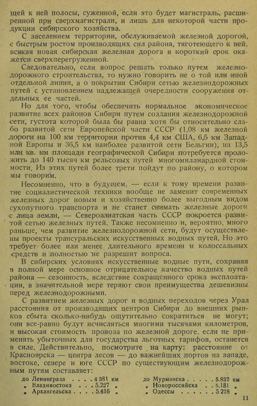 Но достаточно, пользуясь масштабной линейкой, внимательно изучить карту Сибири и ее пути сообщения, чтобы убедиться, что вопрос транспорта, — связывающего географическую Западную Сибирь с внешними рынками в специфически сибирских условиях колоссальной территории, которую нужно обслужить, и огромных расстояний, которые нужно преодолевать, — отнюдь не решается сооружением той или иной широтной или меридиональной железной дороги, созданием более или менее усложненной сети подъездных путей к существующей магистрали со сверхмагистрализацией последней, или, наконец, осуществлением одного или нескольких вариантов трансуральского водного пути.