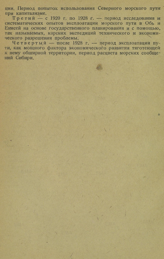 Четвертый — после 1928 г. — период эксплоатации пути, как мощного фактора экономического развития тяготеющей к нему обширной территории, период расцвета морских сообщений Сибири.