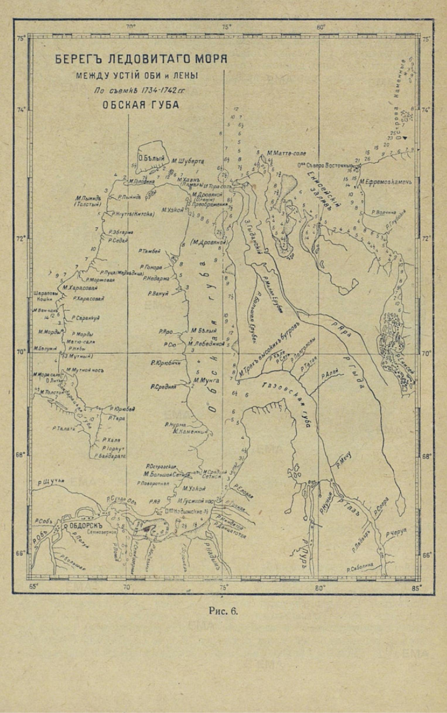В 1851 г. А. Соколов по архивным материалам попытался составить карты севера Сибири общую и, в частности, Обской губы и Енисейского залива, положив в основу этих карт астрономические пункты, определенные в пятидесятых годах XIX столетия (рис. 6).