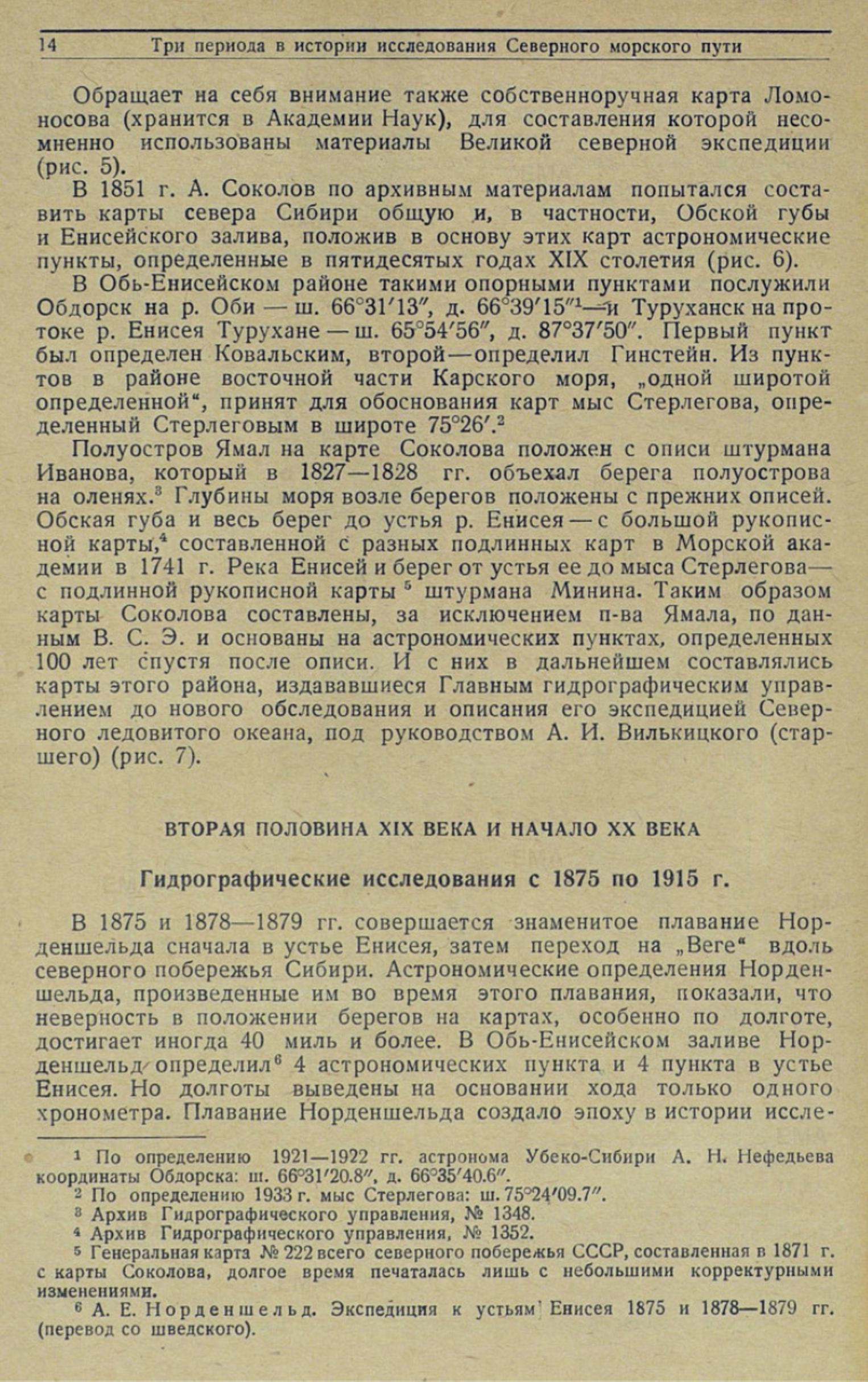 В Обь-Енисейском районе такими опорными пунктами послужили Обдорск на р. Оби — ш. 66°З1'13", д. 66° З9'15" {1}- и Туруханск на протоке р. Енисея Турухане — ш. 65°54'56", д. 87°37'50". Первый пункт был определен Ковальским, второй — определил Гинстейн. Из пунктов в районе восточной части Карского моря, „одной широтой определенной", принят для обоснования карт мыс Стерлегова, определенный Стерлеговым в широте 75°26'. {2}