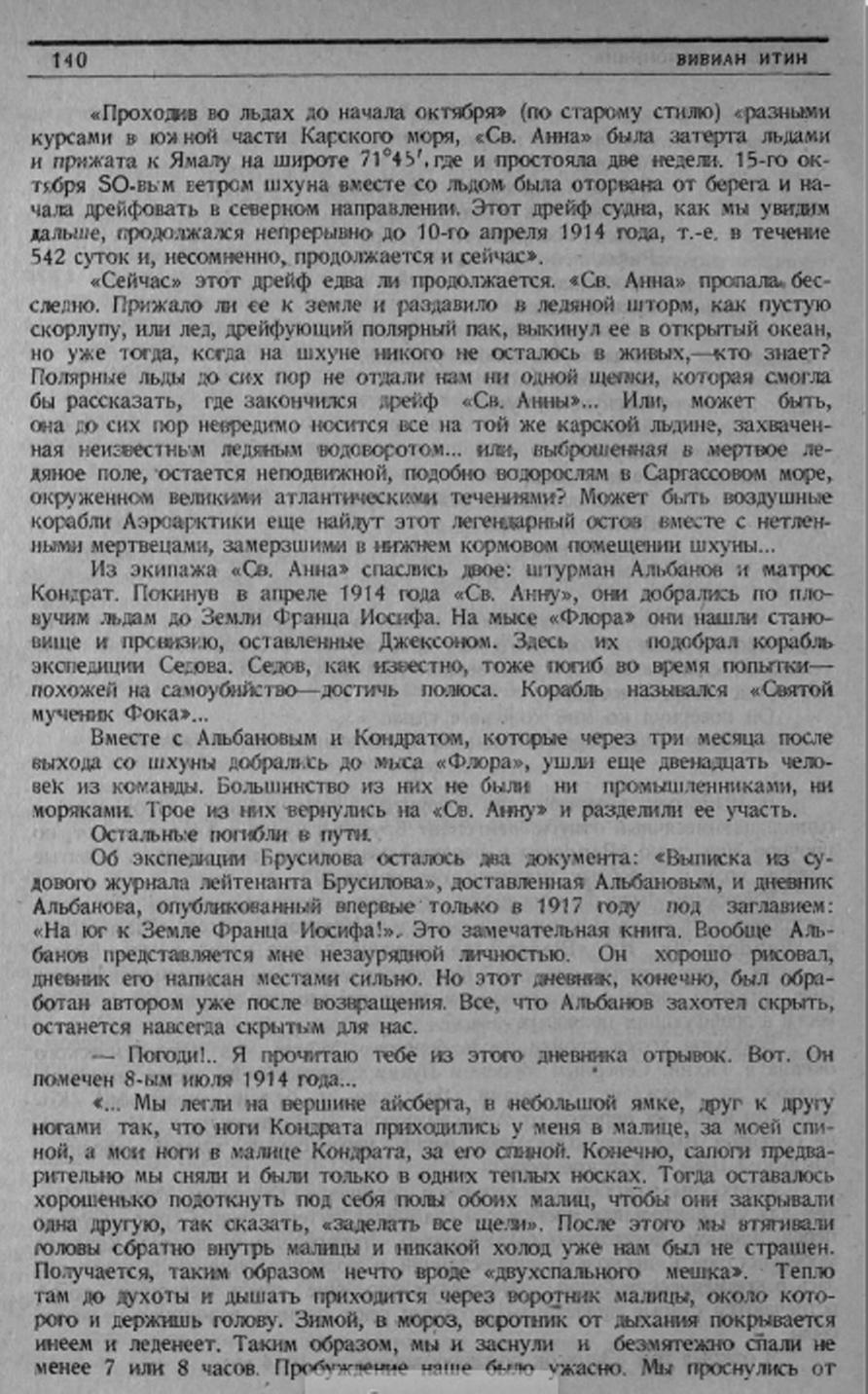 «Сейчас» этот дрейф едва ли продолжается. «Cв. Анна» пропала бесследно. Прижало ли ее к земле и раздавило в ледяной шторм, как пустую скорлупу, или лед, дрейфующий полярный пак, выкинул ее в открытый океан, но уже тогда, когда на шхуне никого не осталось в живых, — кто знает? Полярные льды до сих пор не отдали нам ни одной щепки, которая смогла бы рассказать, где закончился дрейф «Cв. Анны»... Или, может быть, она до сих пор невредимо носится все на той же карской льдине, захваченная неизвестным ледяным водоворотом... или, выброшенная в мертвое ледяное поле, остается неподвижной, подобно водорослям в Саргассовом море, окруженном великими атлантическими течениями? Может быть воздушные корабли Аэроарктики еще найдут этот легендарный остов вместе с нетленными мертвецами, замерзшими в нижнем кормовом помещении шхуны...