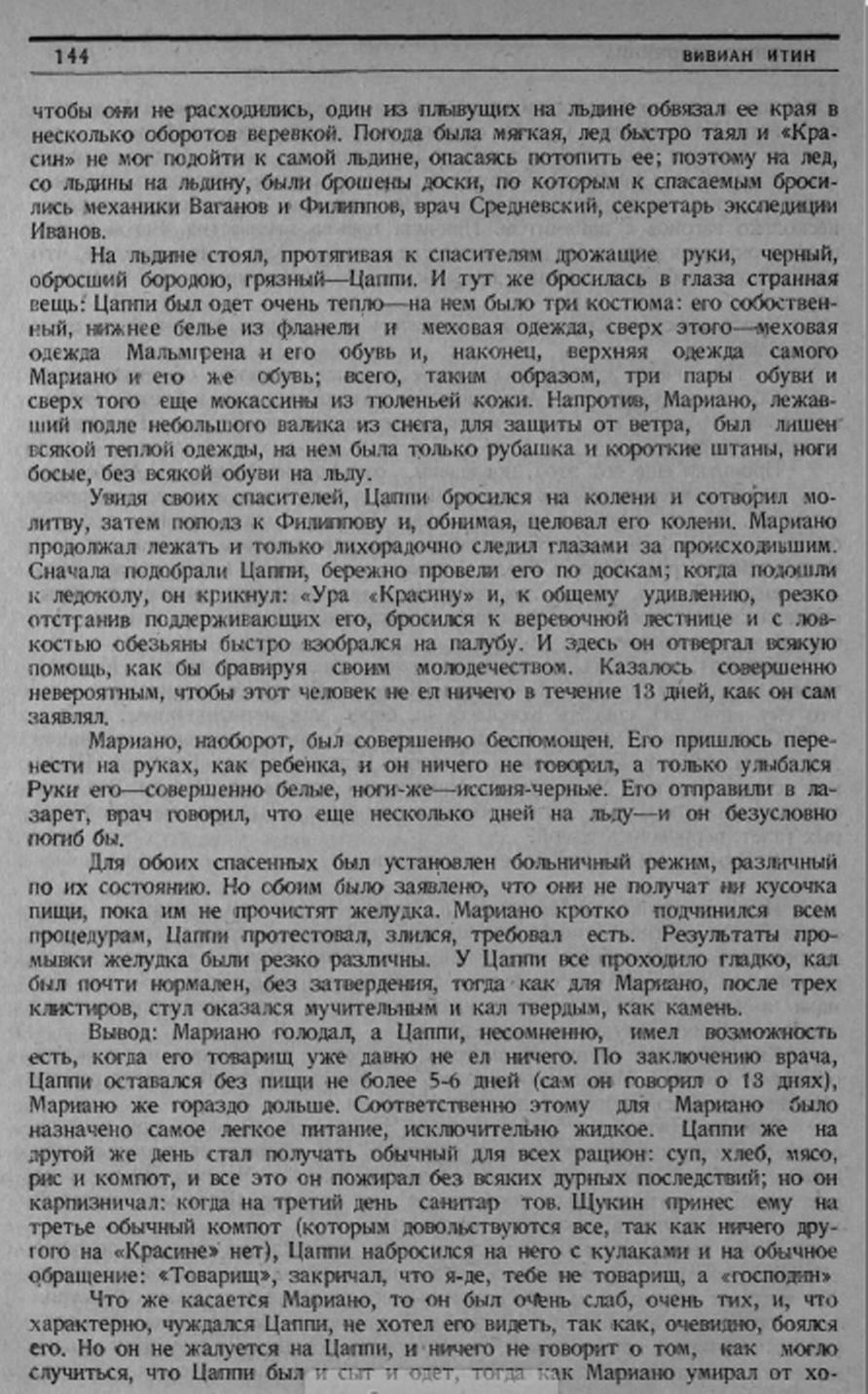 Увидя своих спасителей, Цаппи бросился на колени и сотворил молитву, затем пополз к Филиппову и, обнимая, целовал его колени. Мариано продолжал лежать и только лихорадочно следил глазами за происходившим. Сначала подобрали Цаппи, бережно провели его по доскам; когда подошли к ледоколу, он крикнул: «Ура «Красину» и, к общему удивлению, резко отстранив поддерживающих его, бросился к веревочной лестнице и с ловкостью обезьяны быстро взобрался на палубу. И здесь он отвергал всякую помощь, как бы бравируя своим молодечеством. Казалось совершенно невероятным, чтобы этот человек не ел ничего в течение 13 дней, как он сам заявлял.