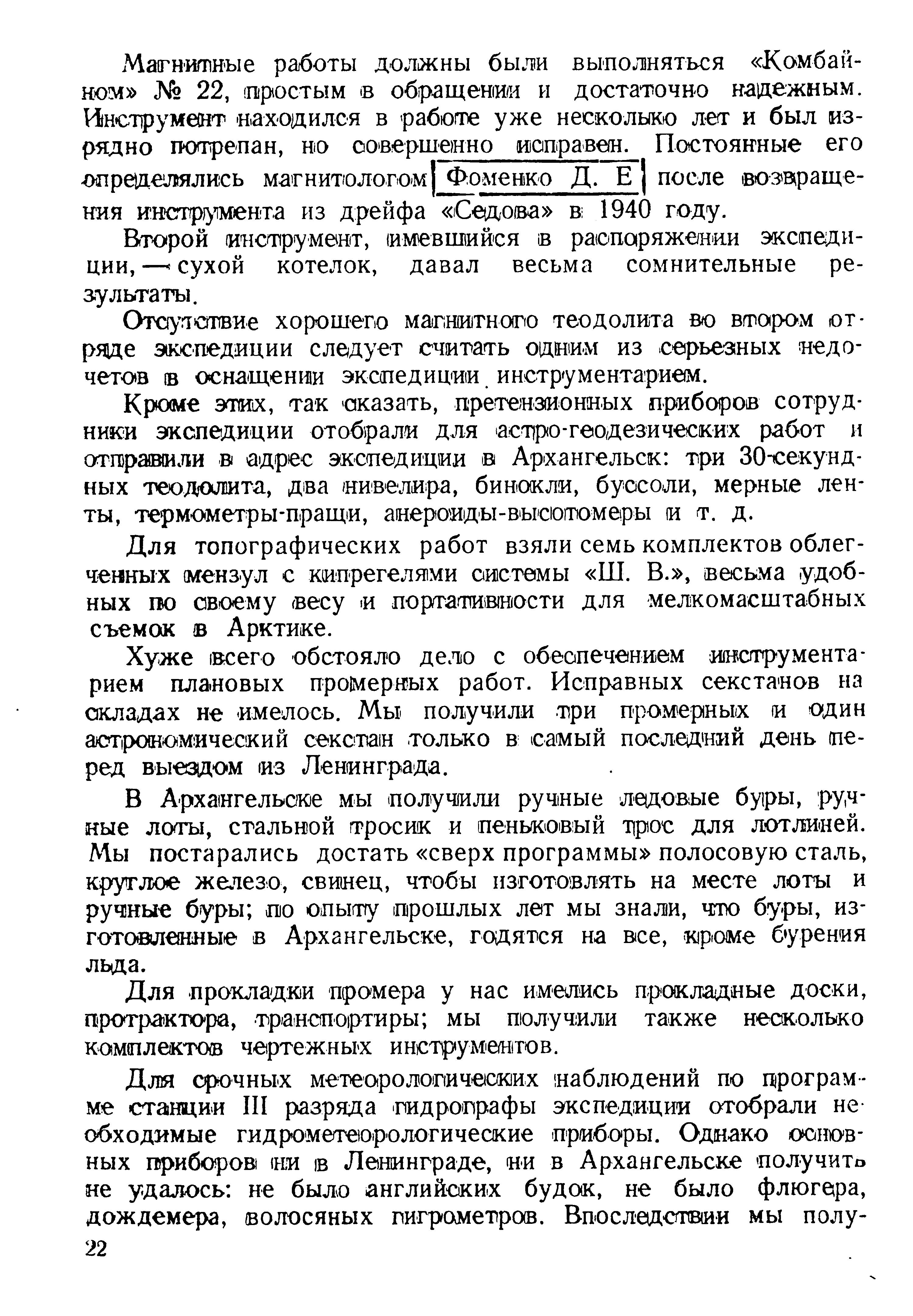 Для топографических работ взяли семь комплектов облегченных мензул с кипрегелями системы «Ш. В. », весьма удобных по своему весу и портативности для мелкомасштабных съемок в Арктике.