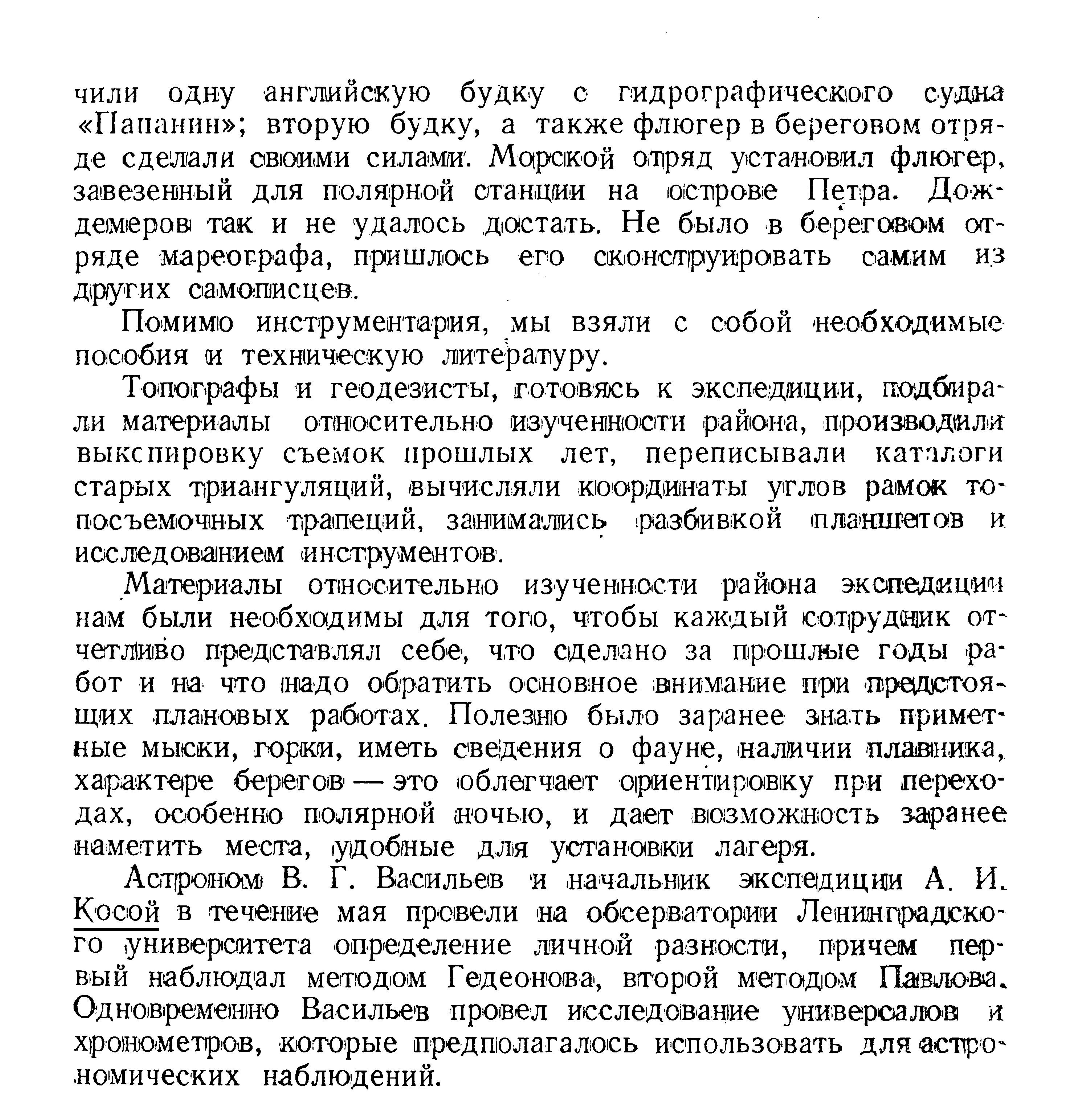Отбор и получение инструментария для экспедиции были поручены старшему гидрографу А. И. Виноградову, прекрасно справившемуся с этой задачей.