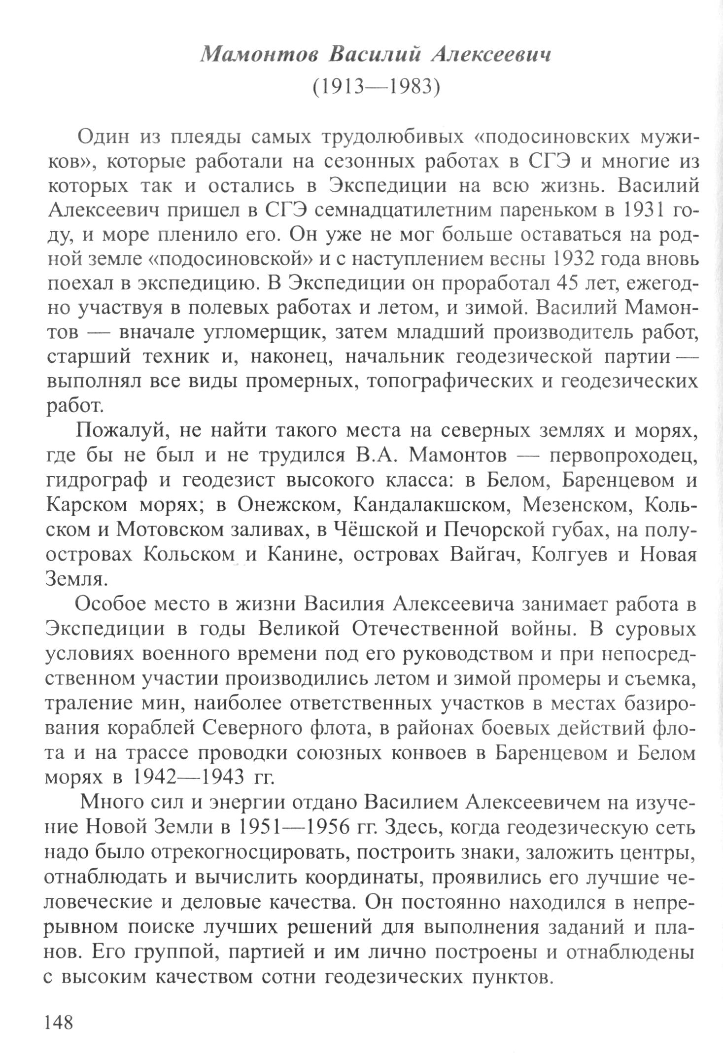 Один из плеяды самых трудолюбивых «подосиновских мужиков», которые работали на сезонных работах в СГЭ и многие из которых так и остались в Экспедиции на всю жизнь. Василий Алексеевич пришел в СГЭ семнадцатилетним пареньком в 1931 году, и море пленило его. Он уже не мог больше оставаться на родной земле «подосиновской» и с наступлением весны 1932 года вновь поехал в экспедицию. В Экспедиции он проработал 45 лет, ежегодно участвуя в полевых работах и летом, и зимой. Василий Мамонтов — вначале угломерщик, затем младший производитель работ, старший техник и, наконец, начальник геодезической партии — выполнял все виды промерных, топографических и геодезических работ.